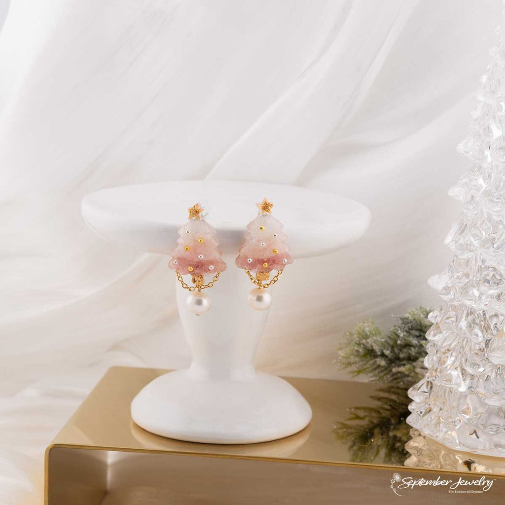 Two Tone Pink Christmas Tree Earrings with Hydrangea Flowers – 14k Plated