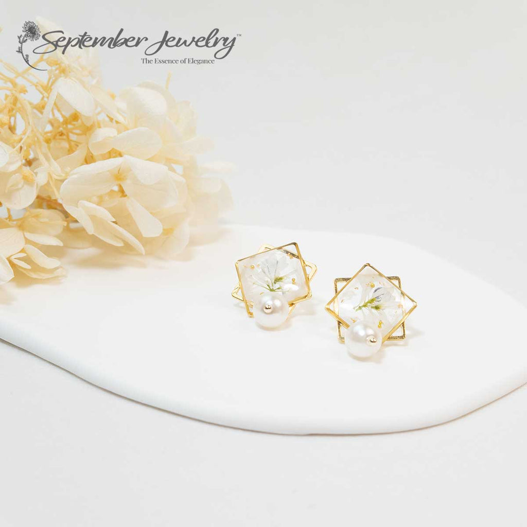 Stacked Square Earrings – White Snowflakes Euphorbia Flowers & Freshwater Pearl, 14K Gold Plated on Silver