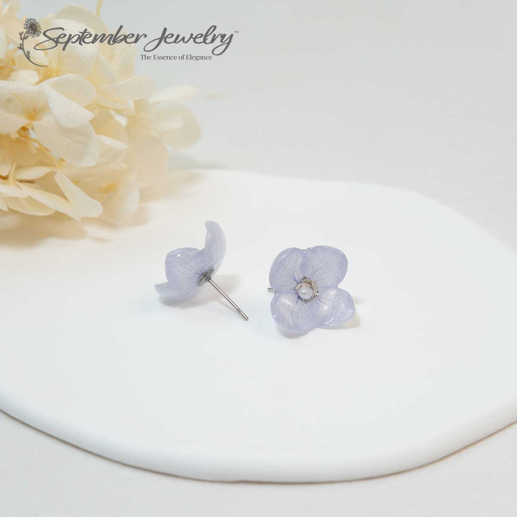 Single Petal Purple Hydrangea Earrings – Real Flowers, Stainless Steel, 0.7"