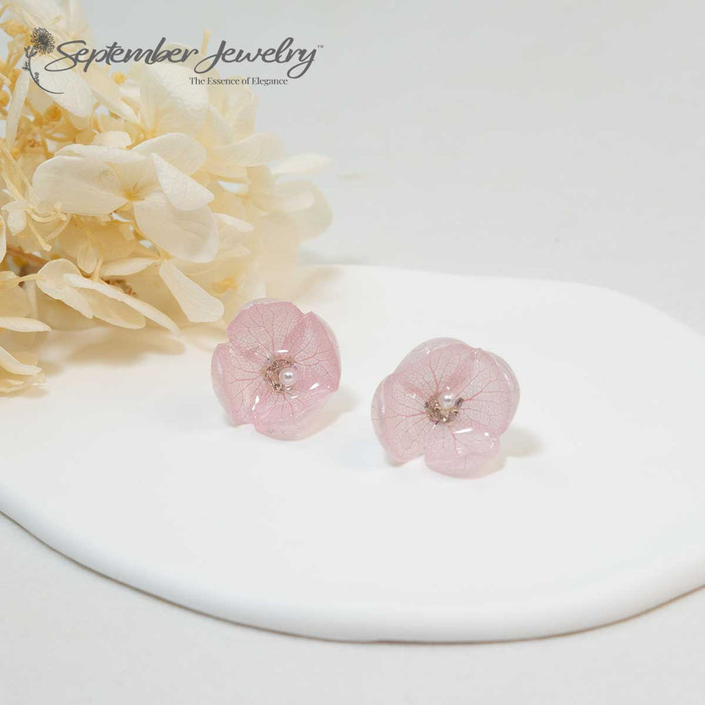 Single Petal Pink Hydrangea Earrings – Real Flowers, Stainless Steel, 0.7"