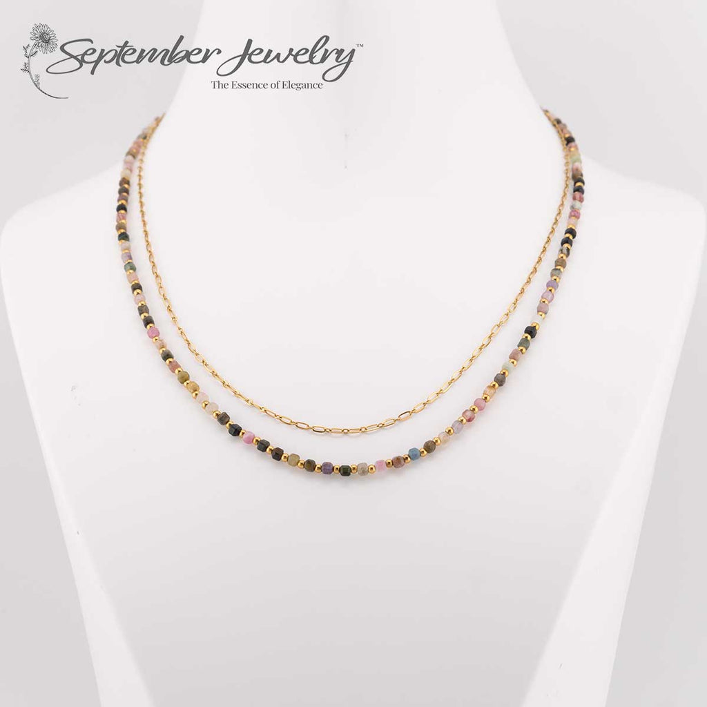 Stacked Tourmaline Gemstone Necklace with 14k Gold Plated Chain – 16 inch + 2 inch Extension