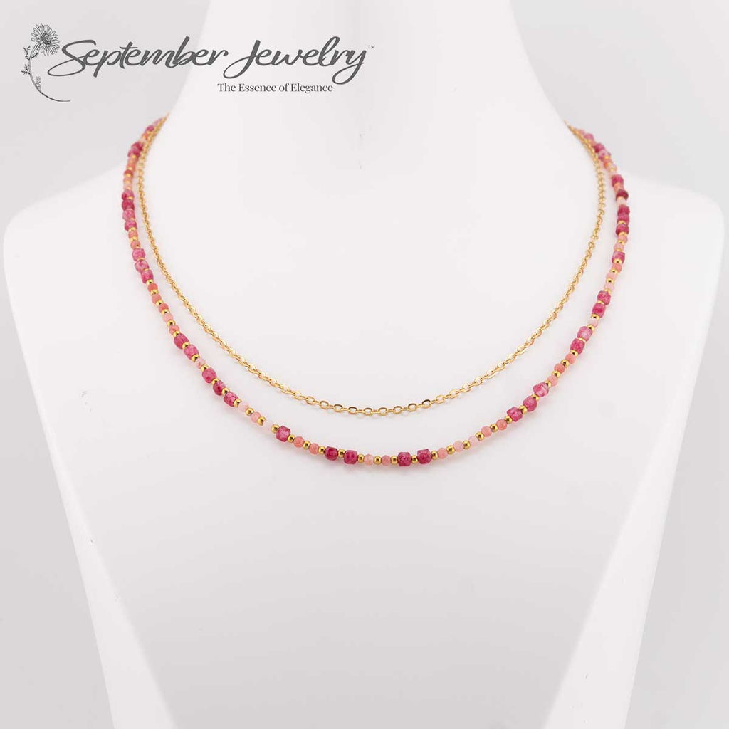 Stacked Ruby and Red Tourmaline Gemstone Necklace on 14k Gold Plated Chain – 16 inch + 2 inch Extension