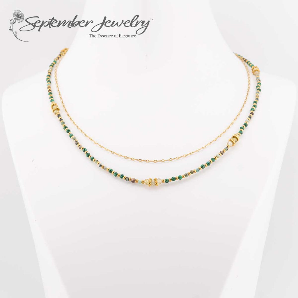 Stacked Malachite, Peridot, and African Turquoise Gemstone Necklace – 14k Gold Plated – 16 inch + 2 inch Extension