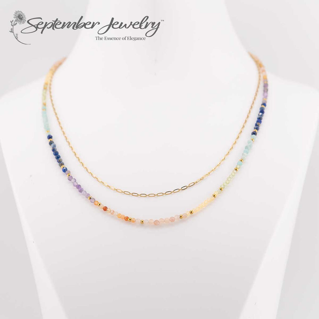 Stacked 7 Chakra Gemstone Necklace with 14k Gold Plated Chain – 16 inch + 2 inch Extension