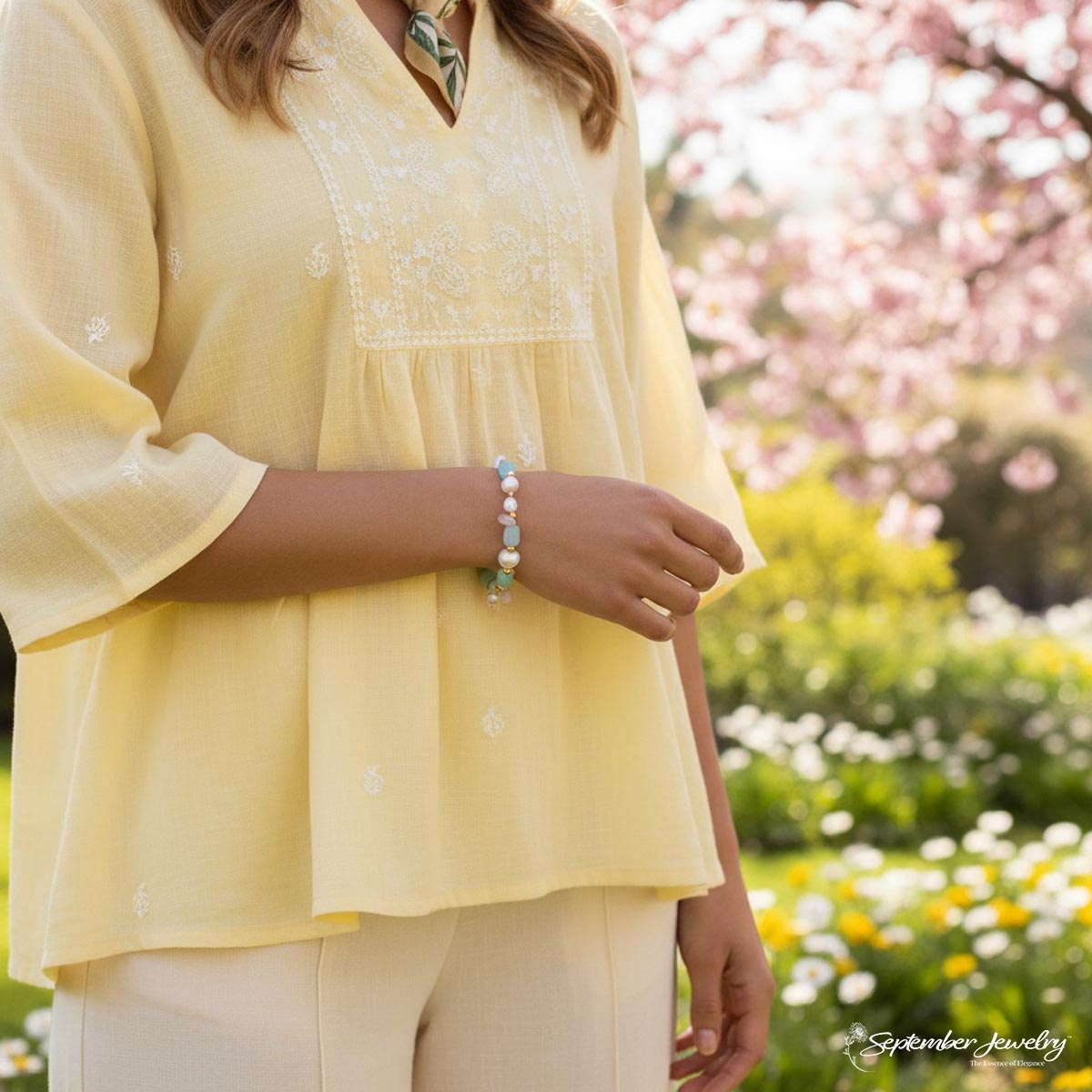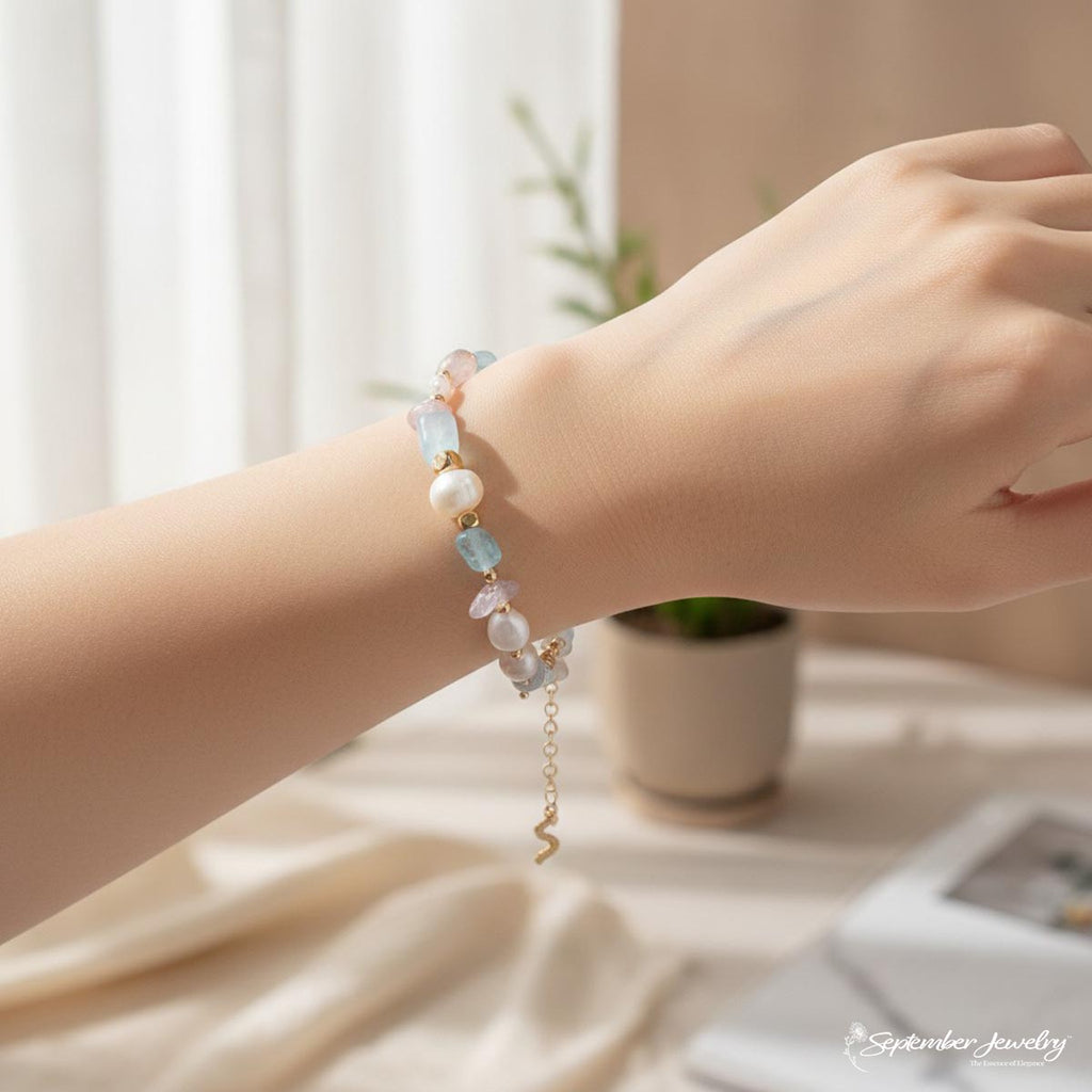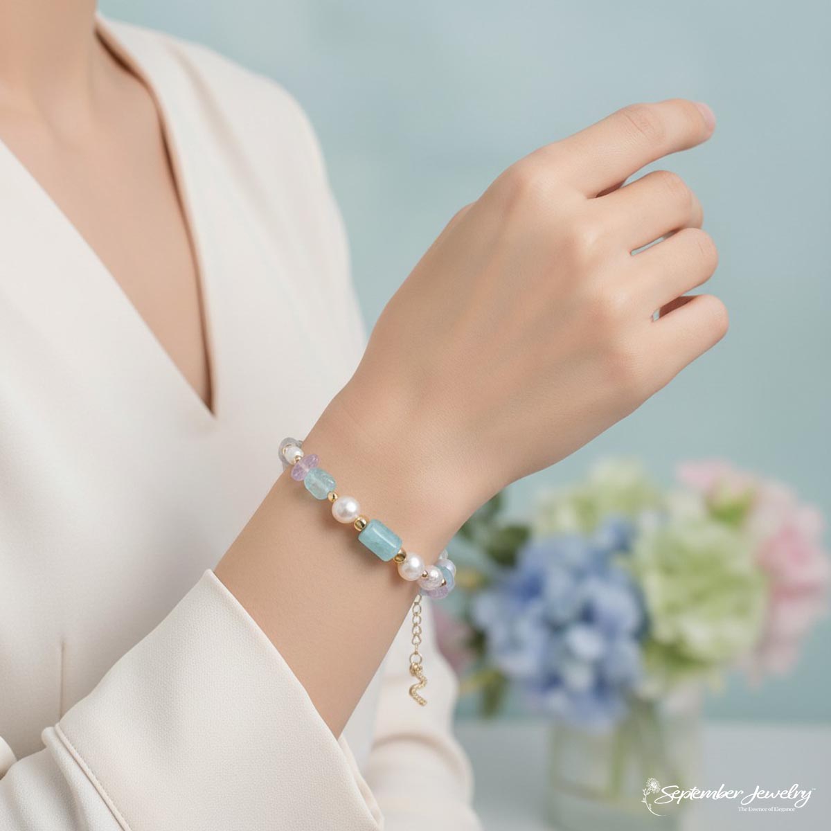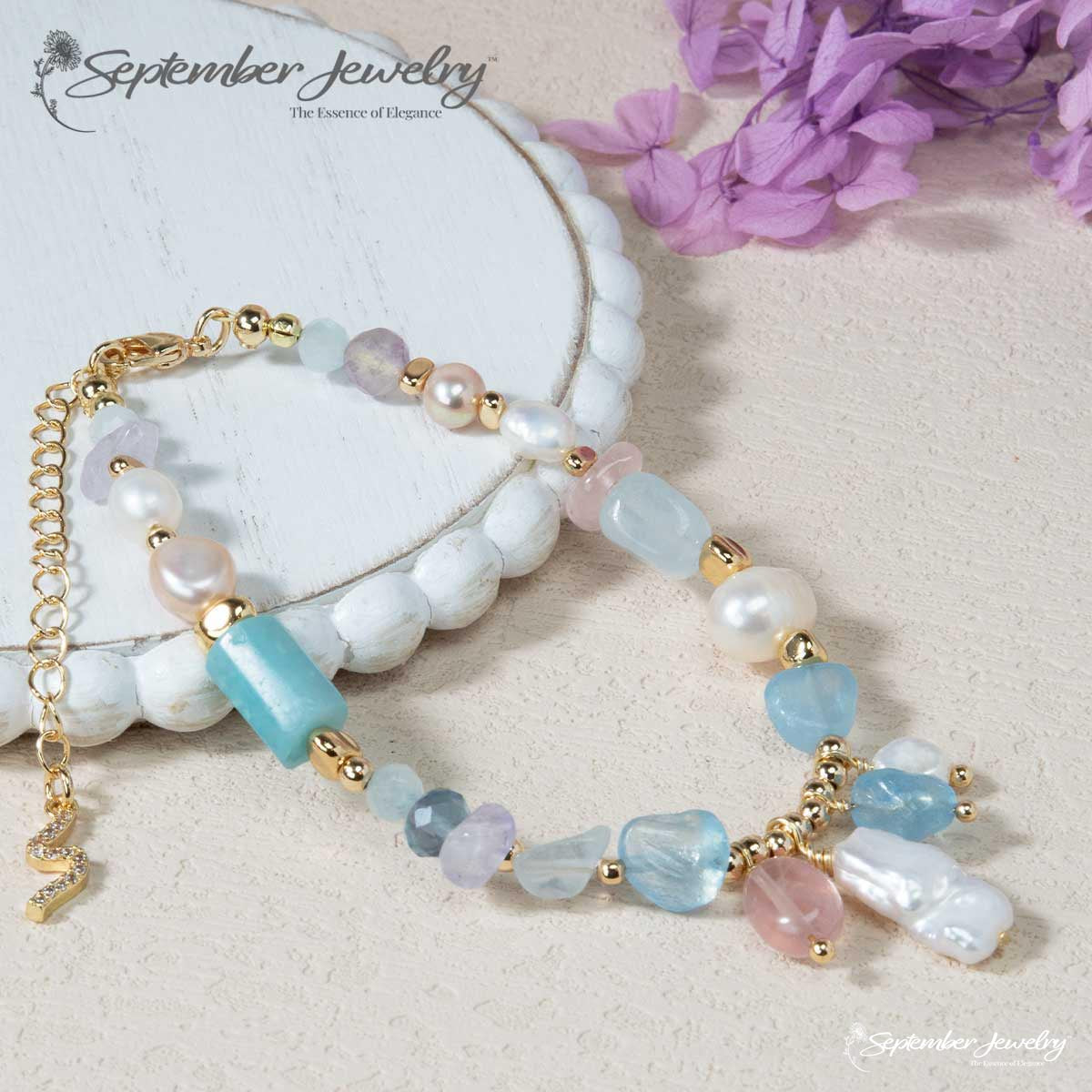 Elevate your style with this breathtaking bracelet, featuring light blue and pastel gemstones including cylinder-shaped amazonite, faceted fluorite, aquamarine, pink quartz, and 14K gold-plated beads. Accented with white baroque pearls and small pink and white freshwater pearls, this 7" bracelet brings a soft, elegant charm to your look. Designed for those who love the beauty of calming blue hues and delicate pastel tones, this piece is both fashionable and meaningful.