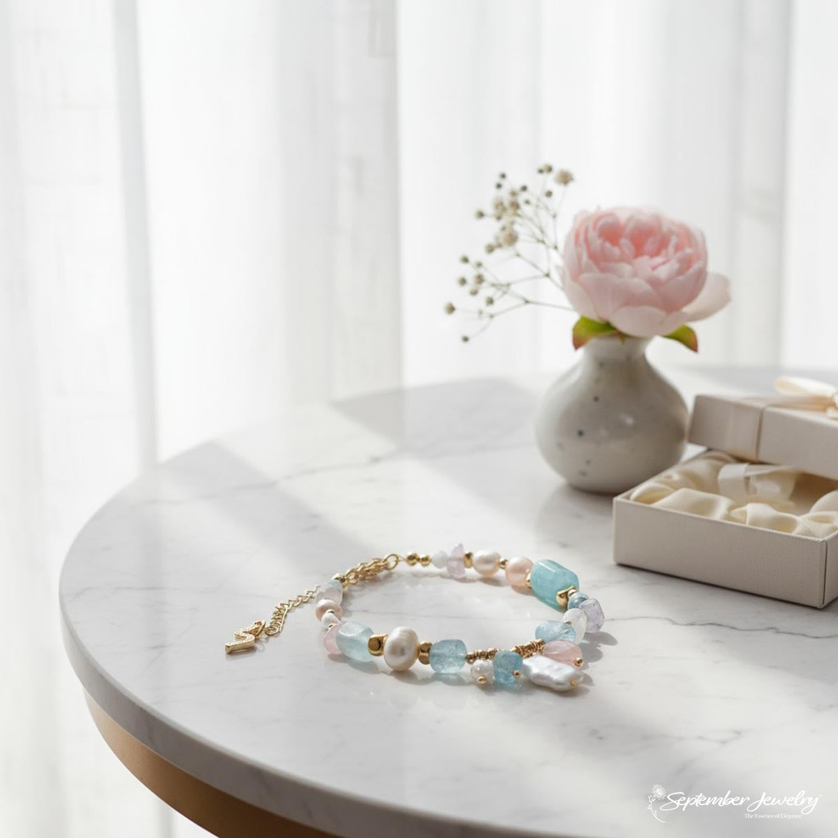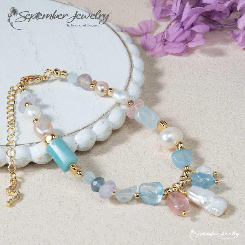 Amazonite, Fluorite, Aquamarine & Pink Quartz Bracelet with Baroque Pearls, and 14K Gold Plated
