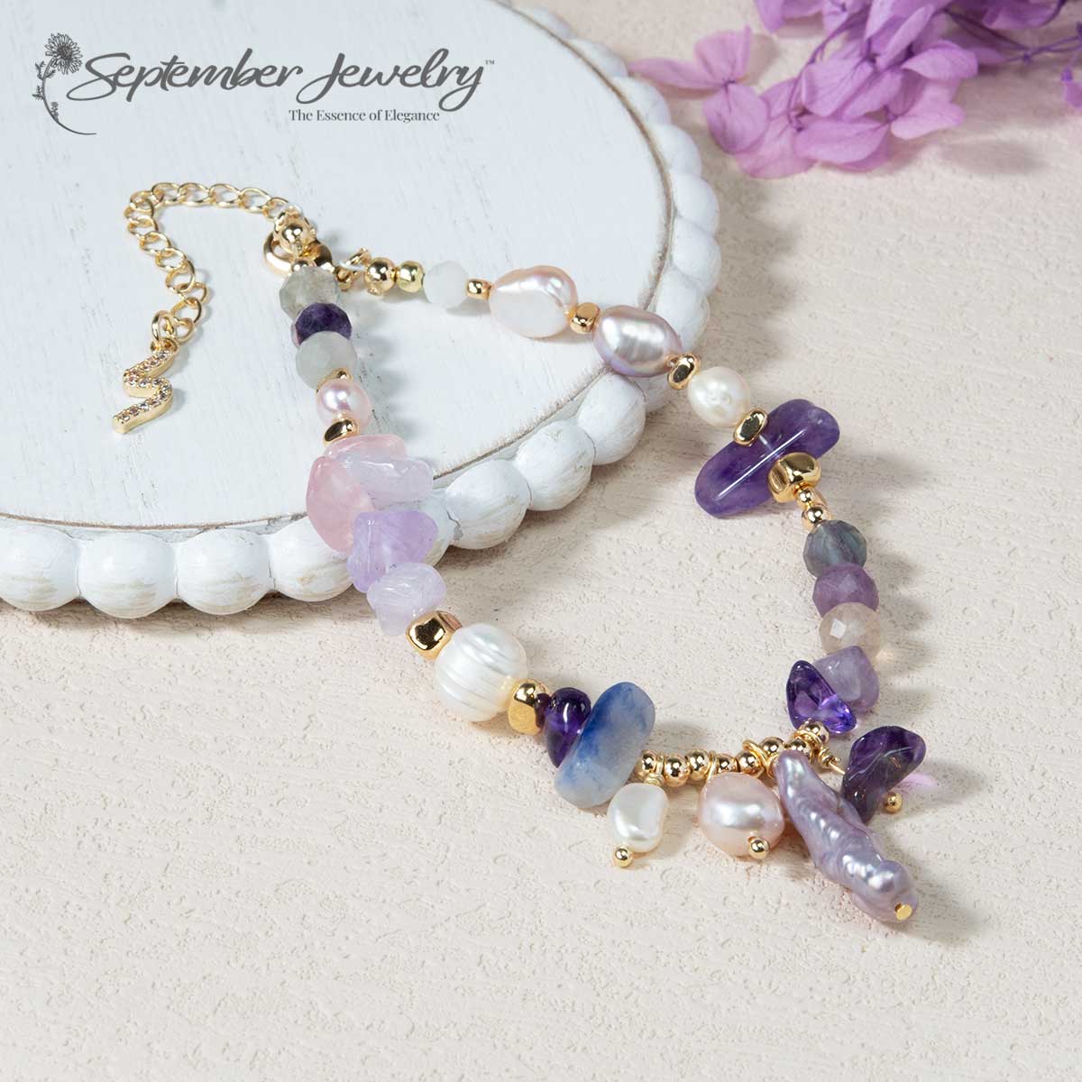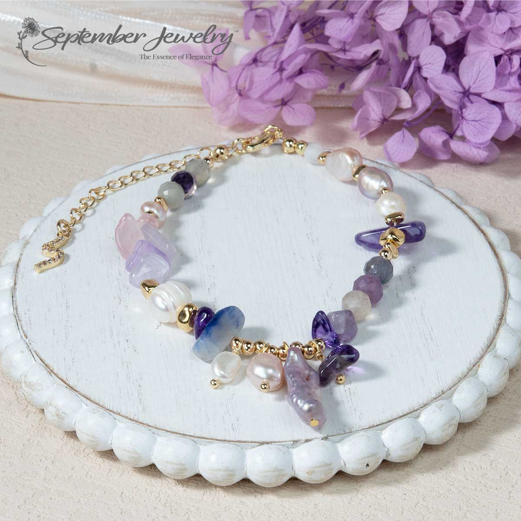 This bracelet is a stunning fusion of rich purple hues, natural gemstones, 14K gold-plated beads, and unique baroque pearls, offering both elegance and deep meaning. Perfect for elevating any outfit, it’s a powerful statement piece for those who value beauty, individuality, and spiritual significance.