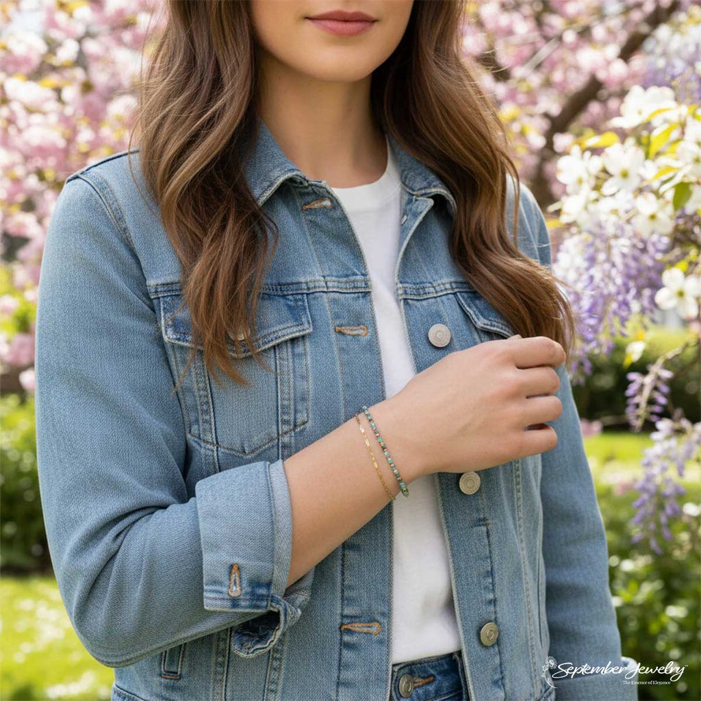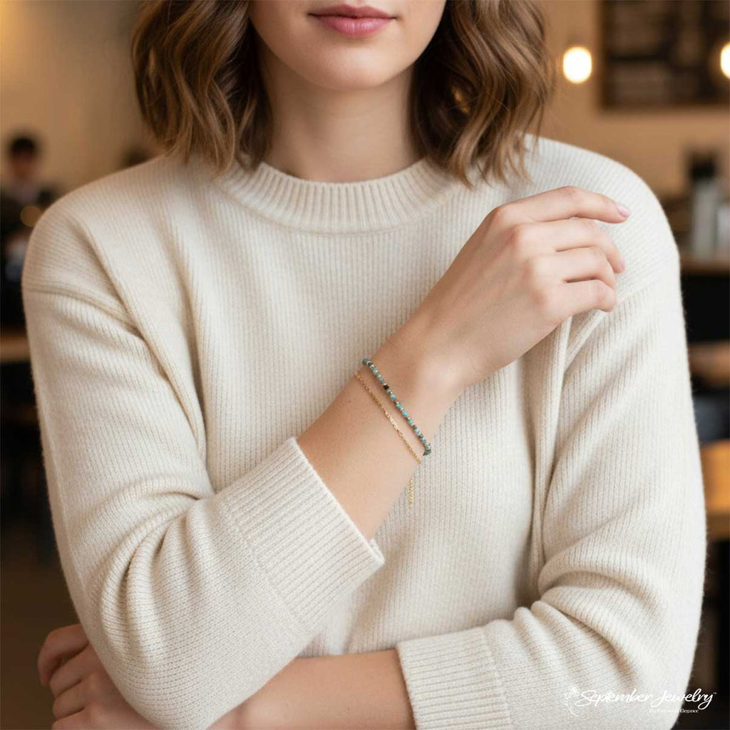 This bracelet combines modern layering with the natural beauty of gemstones, creating a piece that feels fresh yet timeless. The soft movement of the double chains and vibrant blue tones make it an elegant statement for any occasion.