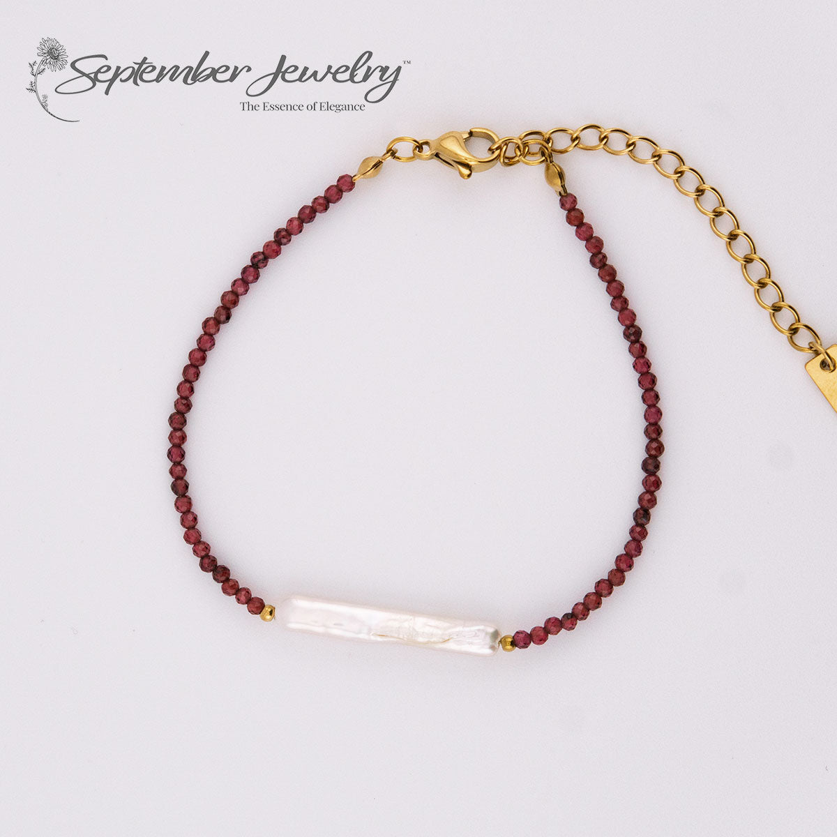 Garnet and Freshwater Toothpick Pearl Bracelet – 14K Gold Plated Stainless Steel | 6.5" + 2" Extension