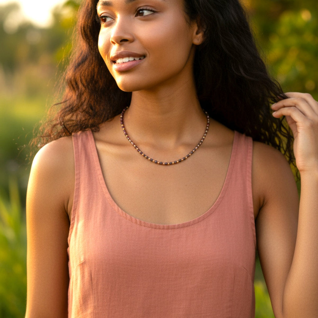 Garnet Gemstone with 14k Plated Beaded Necklace | 16" with 2" extension