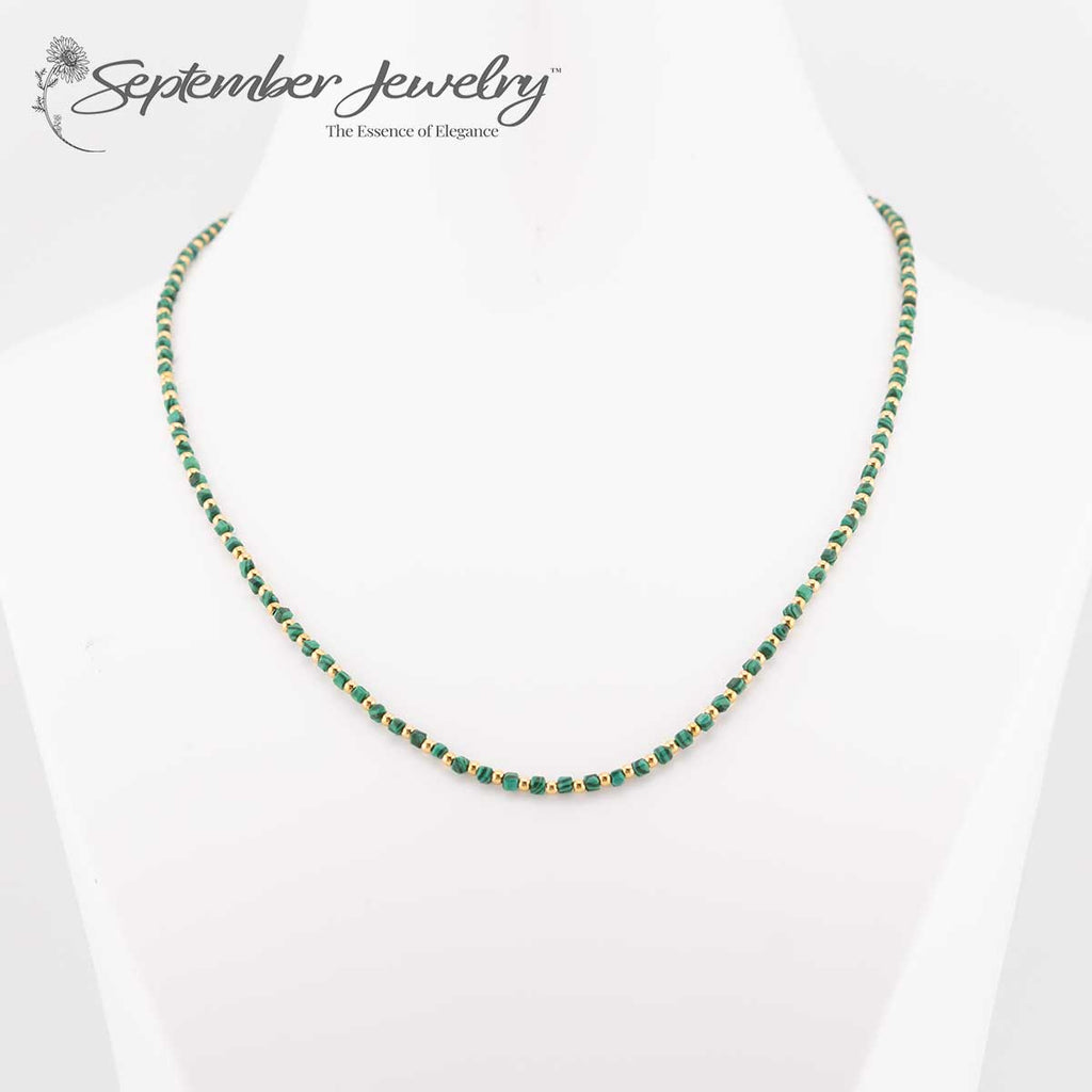 Green Malachite Gemstone Necklace with 14k Gold Plated Beads and Clasp – 16 inch + 2 inch Extension