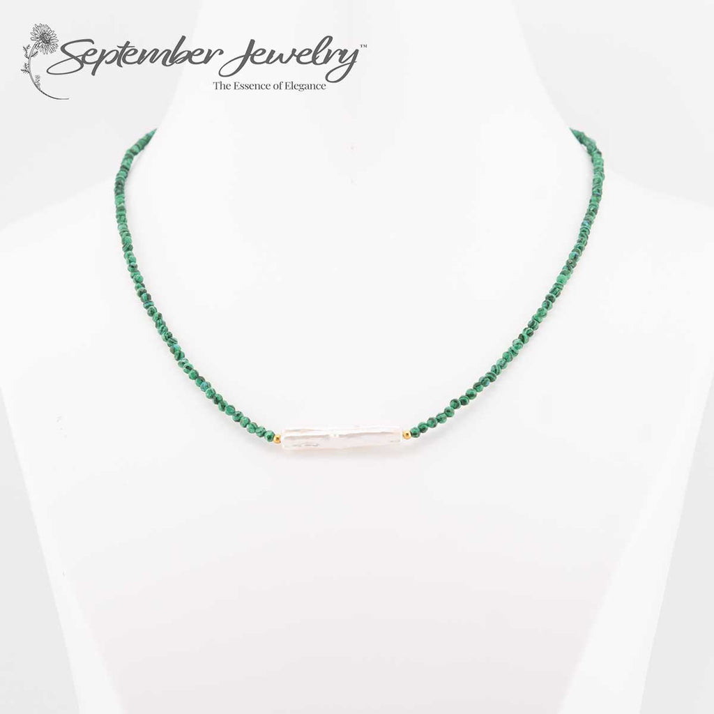 Green Malachite and Freshwater Pearl Necklace with 14k Gold Plated Clasp – 16 inch + 2 inch Extension