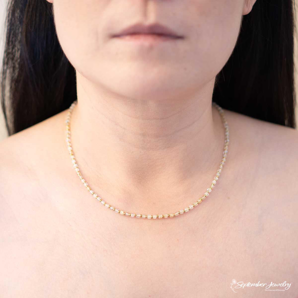 This radiant necklace highlights the warm, golden glow of Citrine, beautifully accented with delicate gold plated beads. The soft shimmer of the stone brings a bright, uplifting touch to your everyday style, creating a look that feels both elegant and cheerful. Its smooth, sunny presence makes it an effortless piece for both minimal and layered looks.