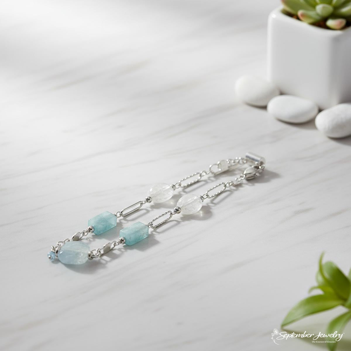 Tranquil and luminous, this bracelet harmoniously blends amazonite, white crystal, and rose quartz to create a soothing palette of seafoam blue, soft blush, and gentle white. Each stone is carefully selected for its natural clarity and energy, forming an elegant composition that feels both calming and empowering. Finished with 14k gold plated accents, it radiates understated luxury and serenity.
