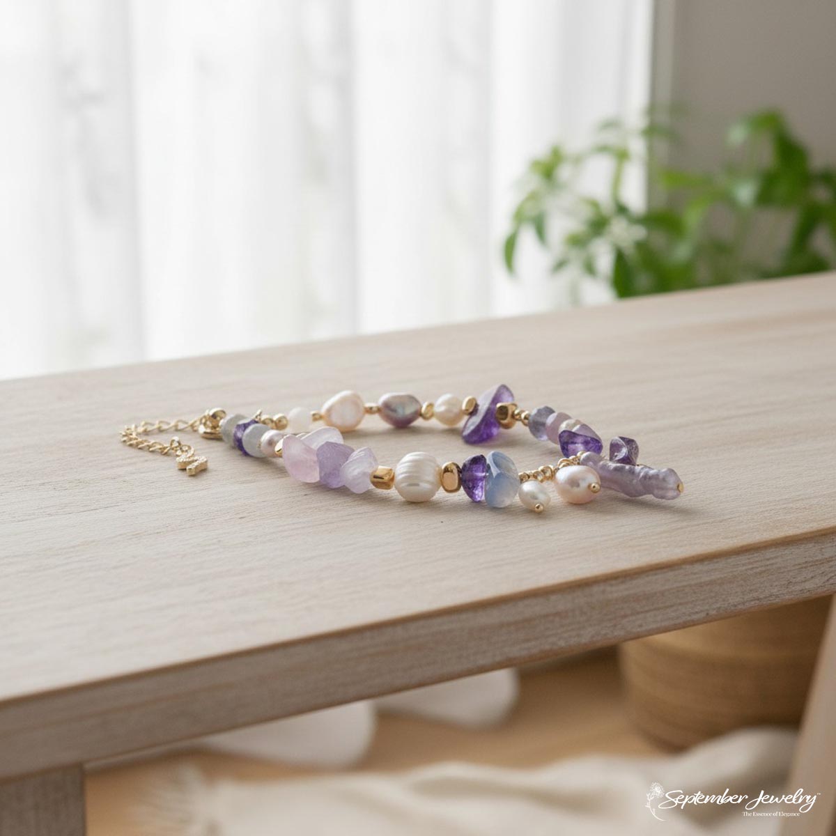 This bracelet is a stunning fusion of rich purple hues, natural gemstones, 14K gold-plated beads, and unique baroque pearls, offering both elegance and deep meaning. Perfect for elevating any outfit, it’s a powerful statement piece for those who value beauty, individuality, and spiritual significance.