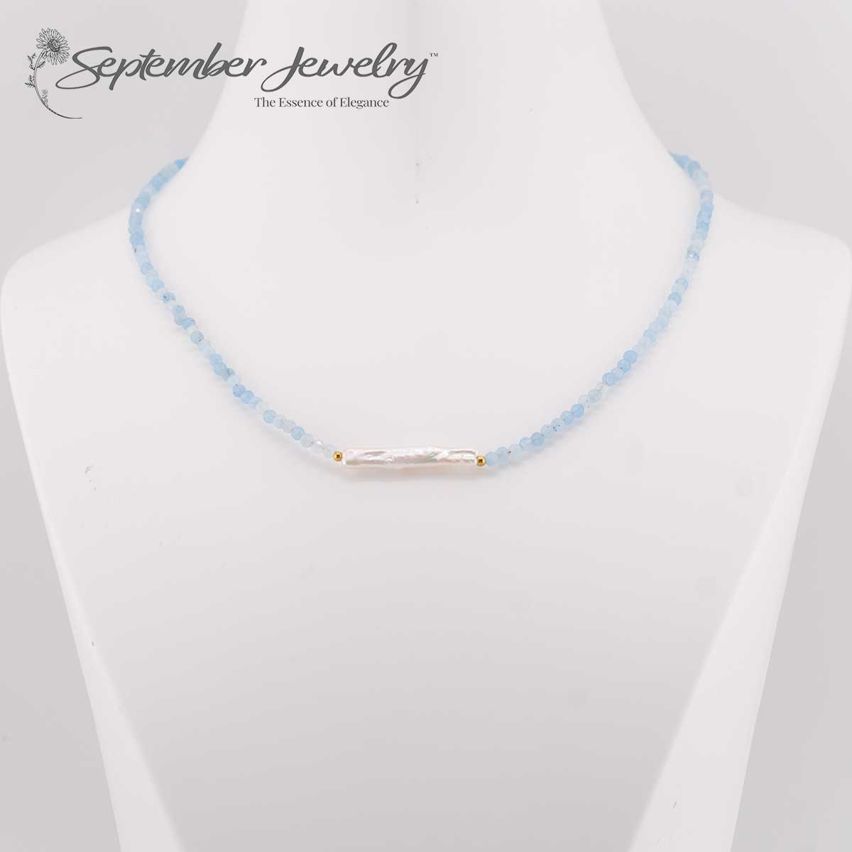 Aquamarine and Freshwater Pearl Necklace with 14k Gold Plated Beads and Clasp – 16 inch + 2 inch Extension