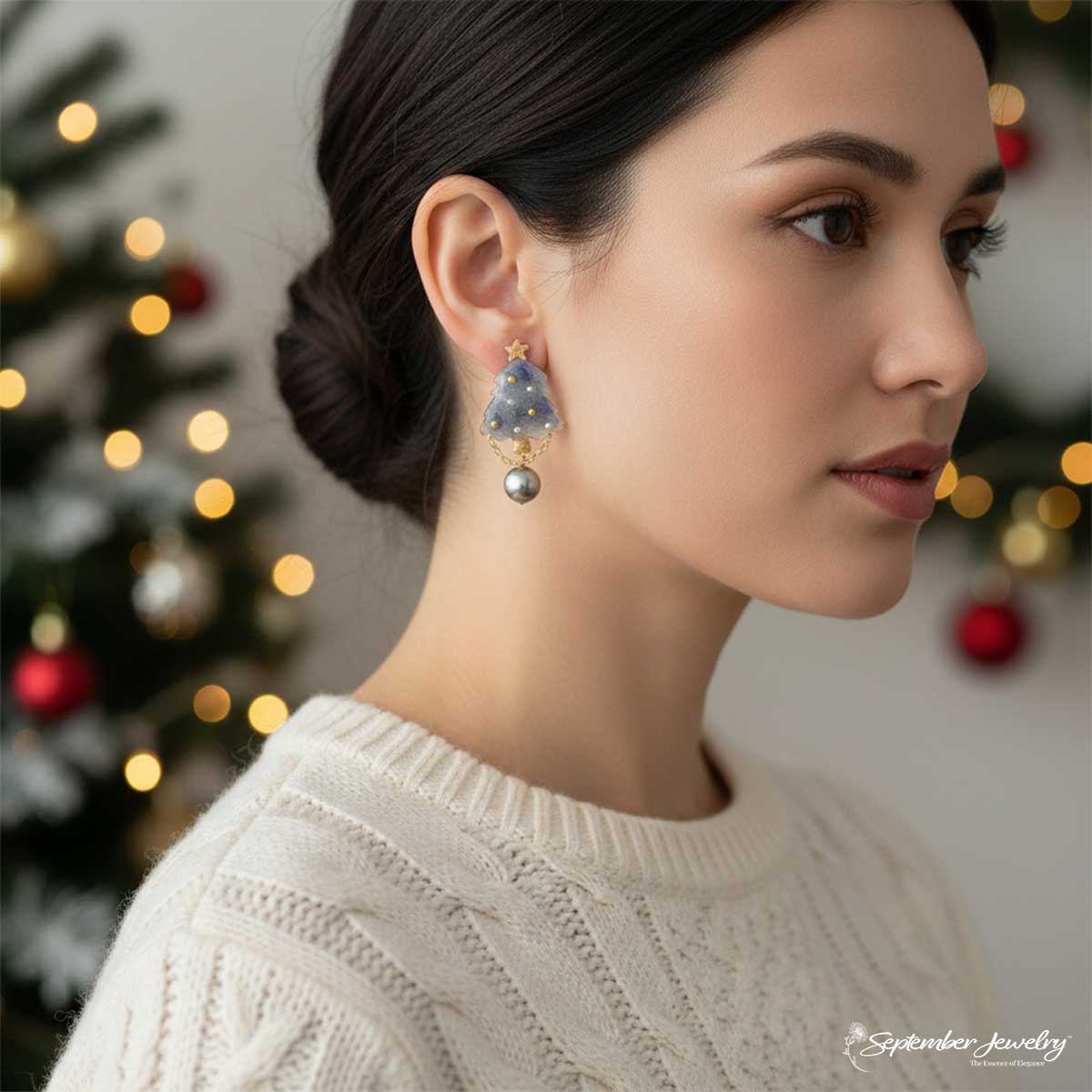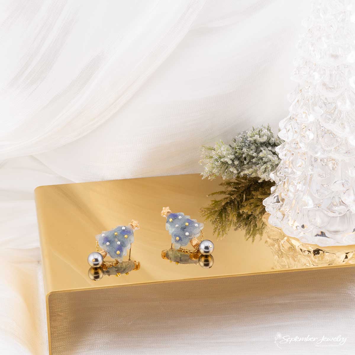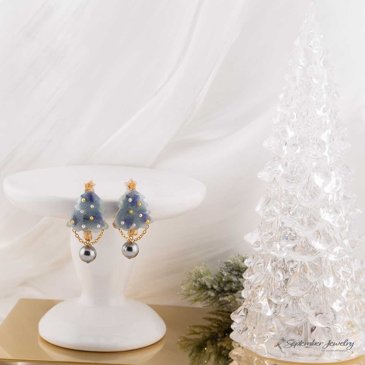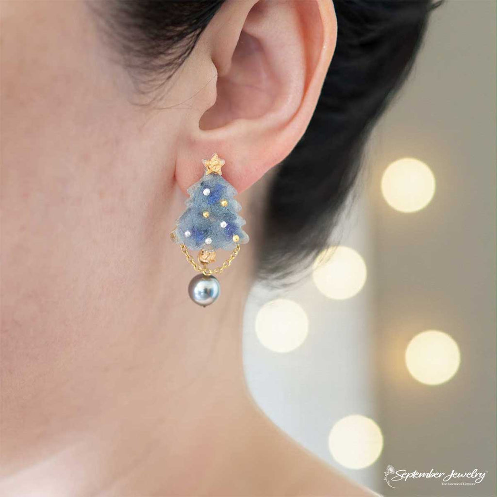 A winter dream brought to life, these earrings feature a charming blue Christmas tree silhouette adorned with real hydrangea petals and a luminous pearl accent. Their cool tones and delicate shimmer evoke the peaceful beauty of freshly fallen snow and the joy of the holiday season.