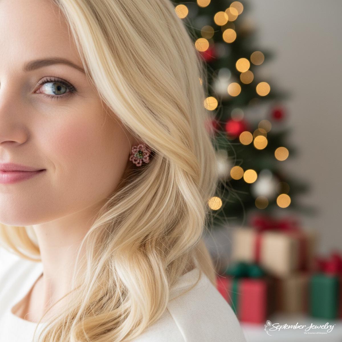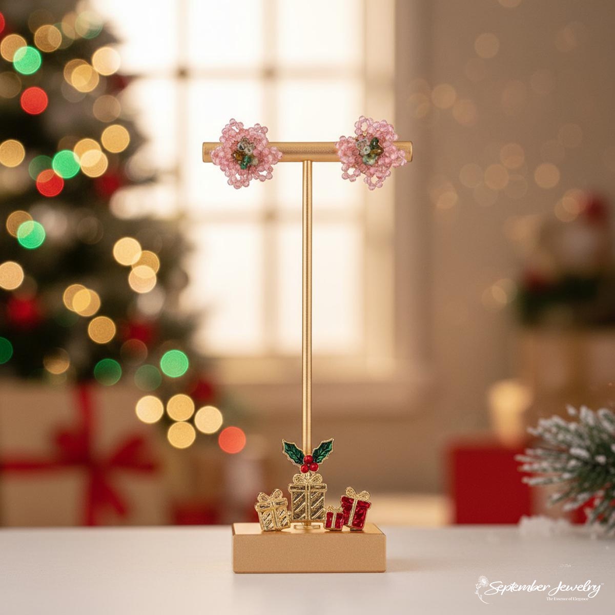 Delicately crafted with a soft pink bead flower, these earrings capture the warmth and joy of the holiday season. Their subtle shimmer and golden finish evoke the charm of Christmas décor, graceful, feminine, and timelessly festive.