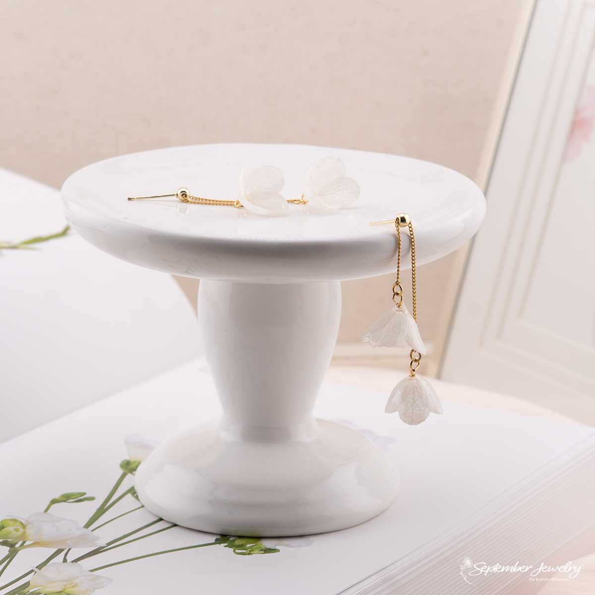 Delicate and luminous, these dual, white hydrangea drop earrings embody the effortless grace of natural blooms. Two real hydrangea petals, preserved in resin, hang from an adjustable gold chain that allows subtle movement and versatility in length. The design radiates soft sophistication, balancing organic beauty with modern fluidity.