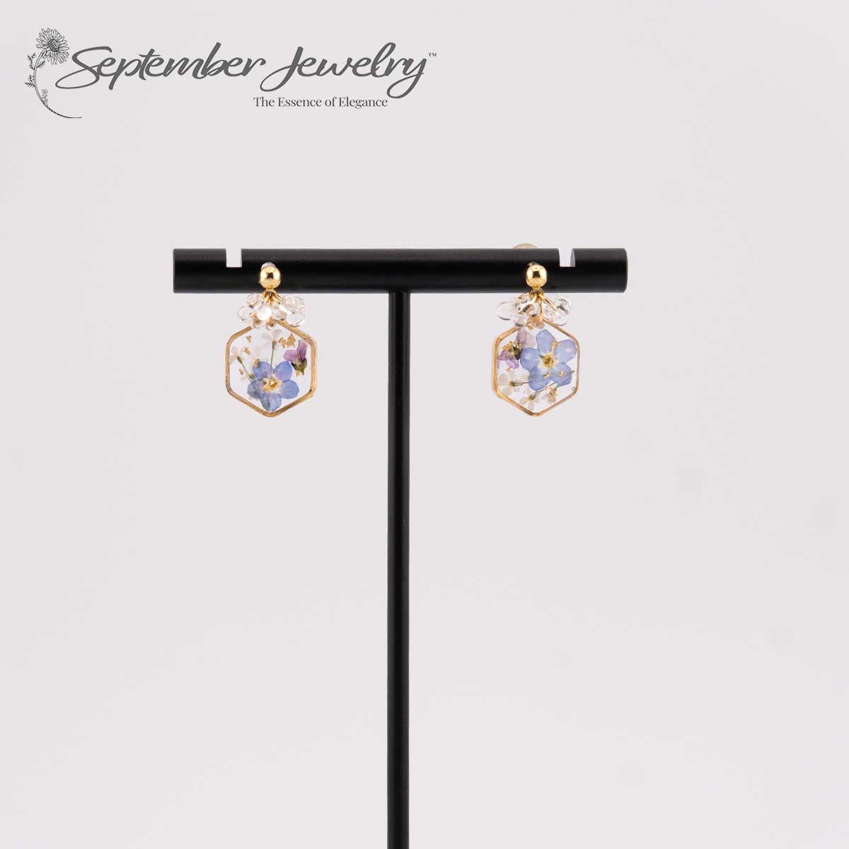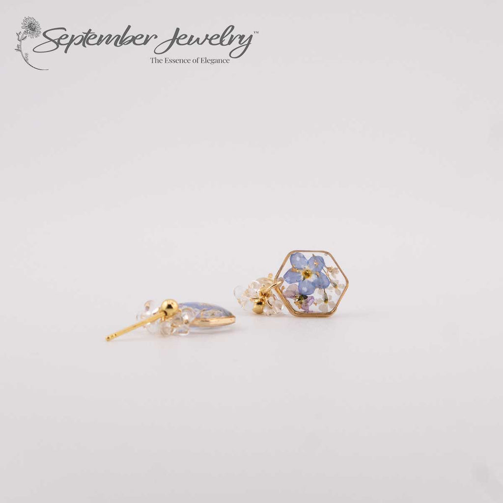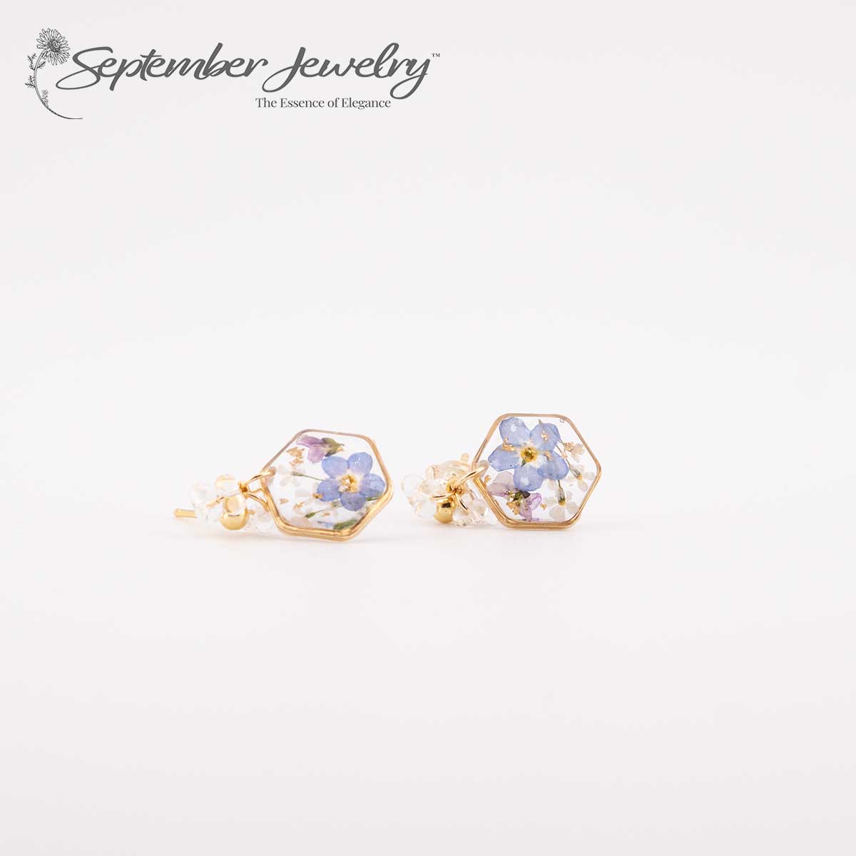Charming and delicate, these petite Forget-Me-Not earrings feature soft blue and pink floral details paired with fine white lace. Their compact size offers subtle elegance, while the gentle pastel tones evoke the sweetness of spring and the sentiment of cherished memories. The 14k gold plated finish adds a graceful warmth, completing a design that feels both timeless and tender.