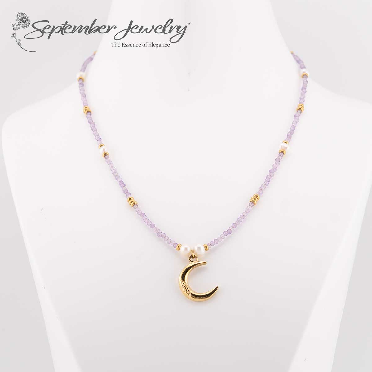 A romantic and ethereal design, this necklace combines genuine lavender amethyst gemstones with luminous freshwater pearls, delicately accented by a crescent moon pendant. The soft lilac tones of amethyst harmonize beautifully with the iridescent glow of pearls and the warm radiance of 14k gold plating. Adjustable from 16 to 18 inches, this piece drapes elegantly along the neckline, embodying both serenity and celestial charm.