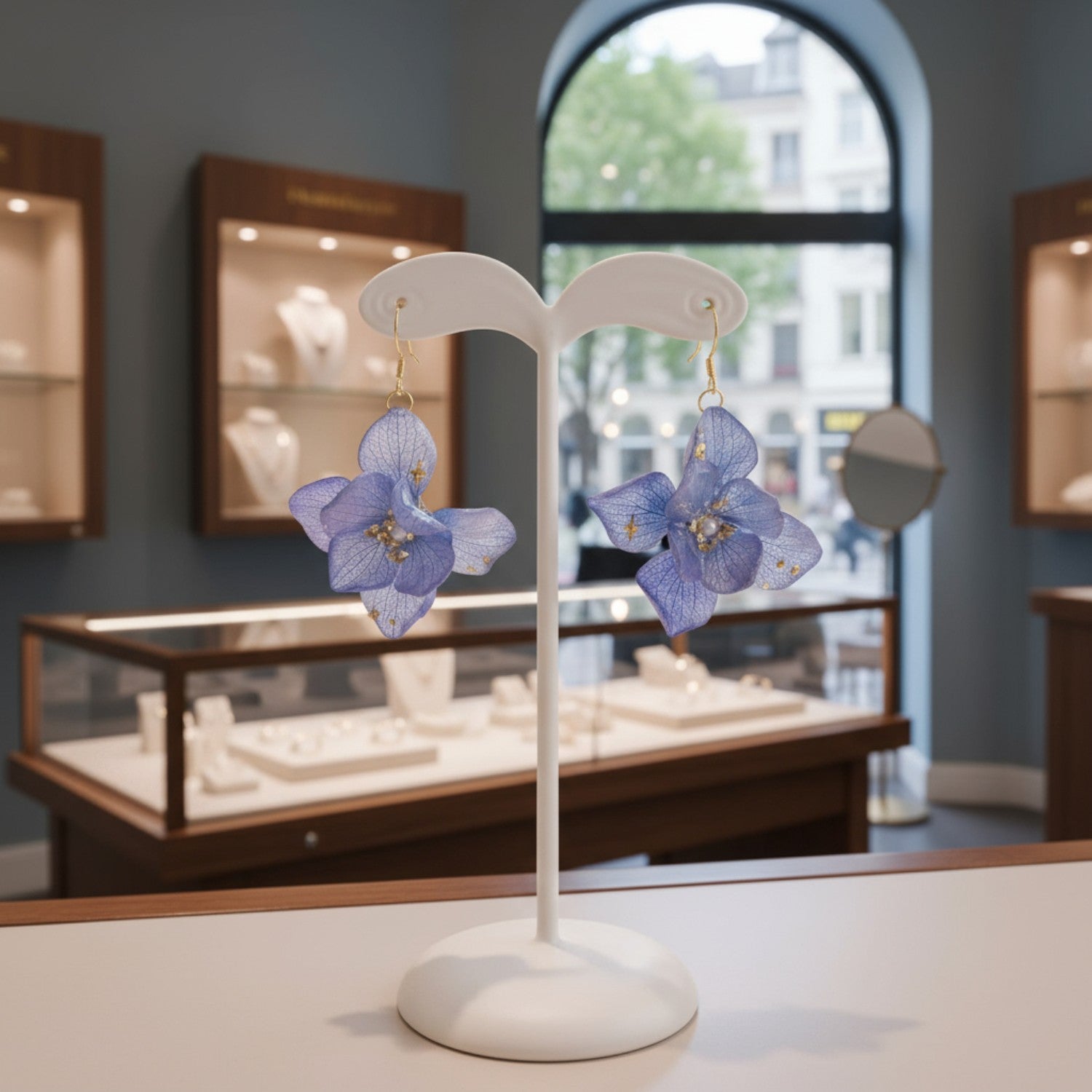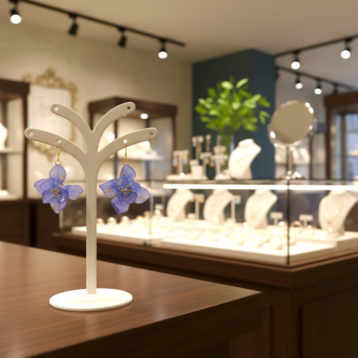 To preserve the resin-coated petals’ natural color and clarity, store in a cool, dry place away from direct sunlight and moisture. Wipe gently with a soft, dry cloth after wear.