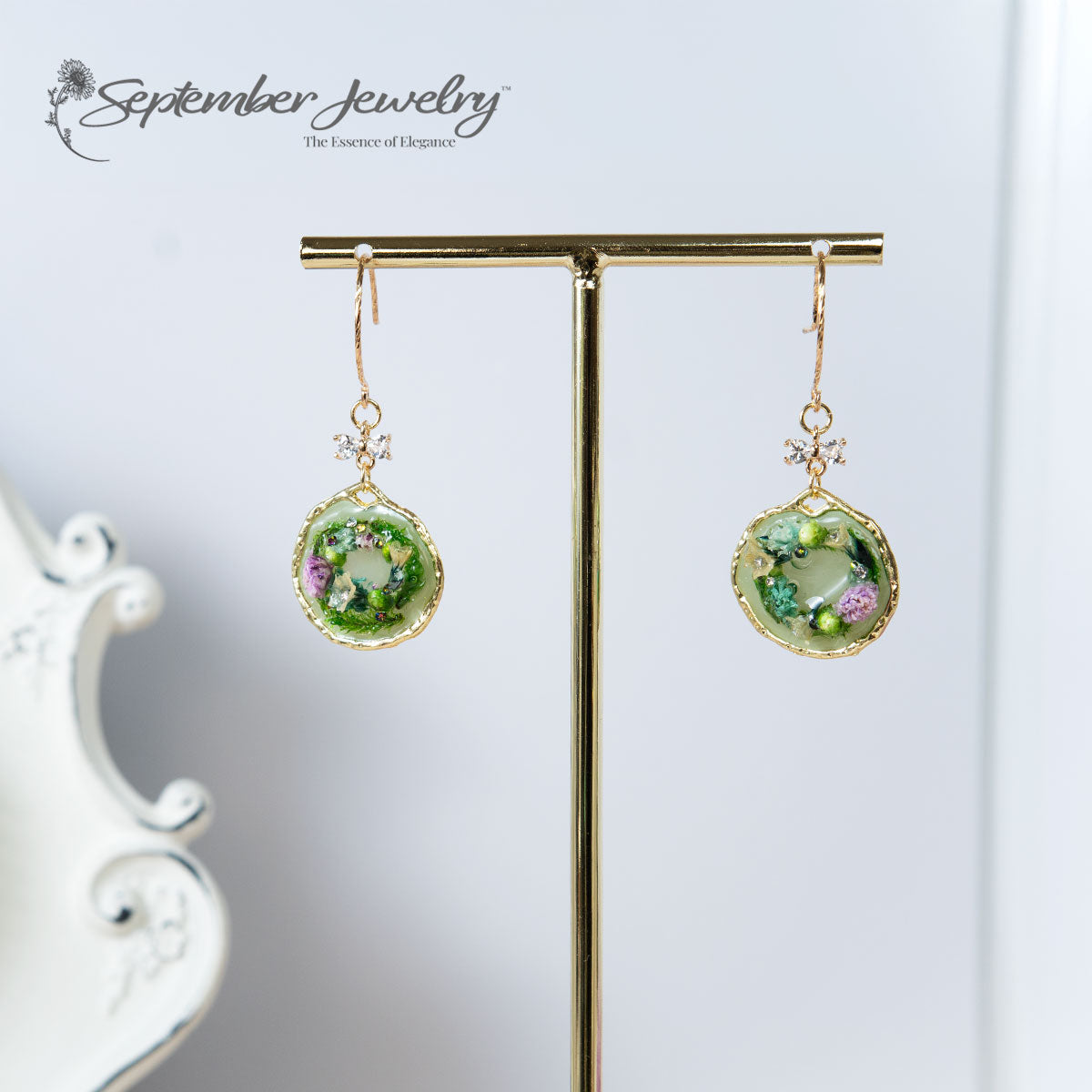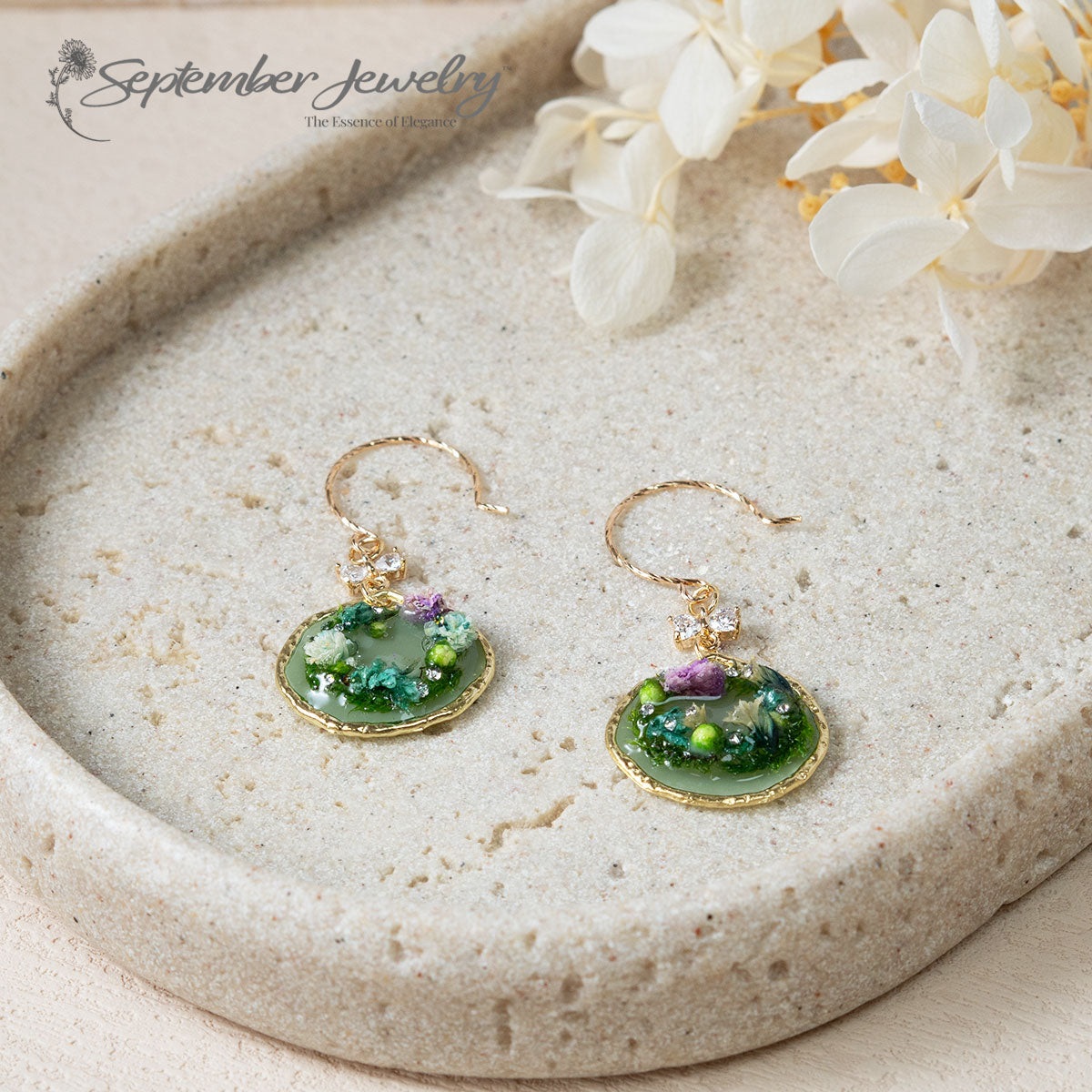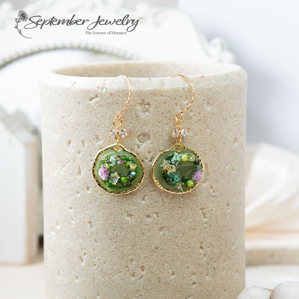 Celebrate the season with our enchanting Miniature Wreath Earrings featuring a shiny cubic zirconia bow. Handmade with real dried moss and a variety of small dried flowers, these earrings are coated in resin for durability and a beautiful finish. Their festive design makes them the perfect accessory for holiday gatherings or any cheerful occasion!