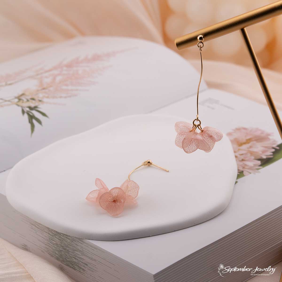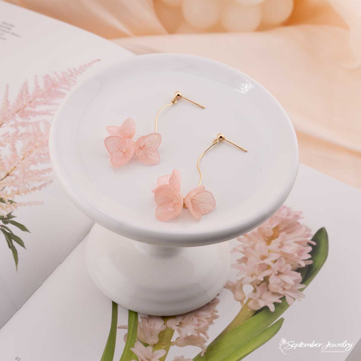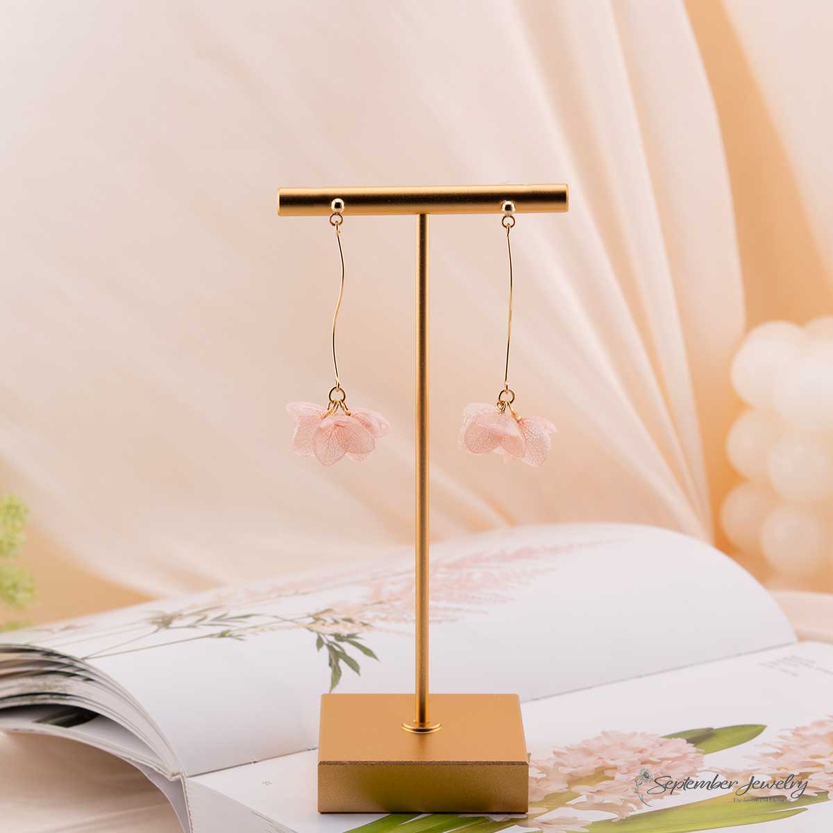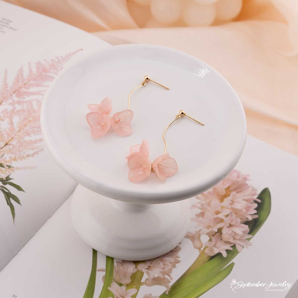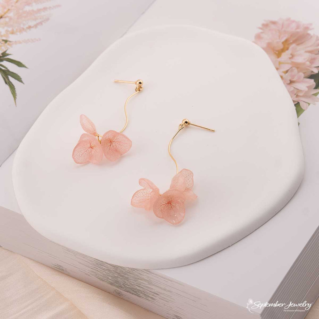 Graceful and radiant, these pink hydrangea S-curve drop earrings embody the delicate rhythm of nature in bloom. Each real hydrangea petal is preserved in resin, capturing soft pink tones that shimmer with gentle light. The flowing S-curve silhouette adds a sculptural elegance, creating movement that feels both natural and refined.