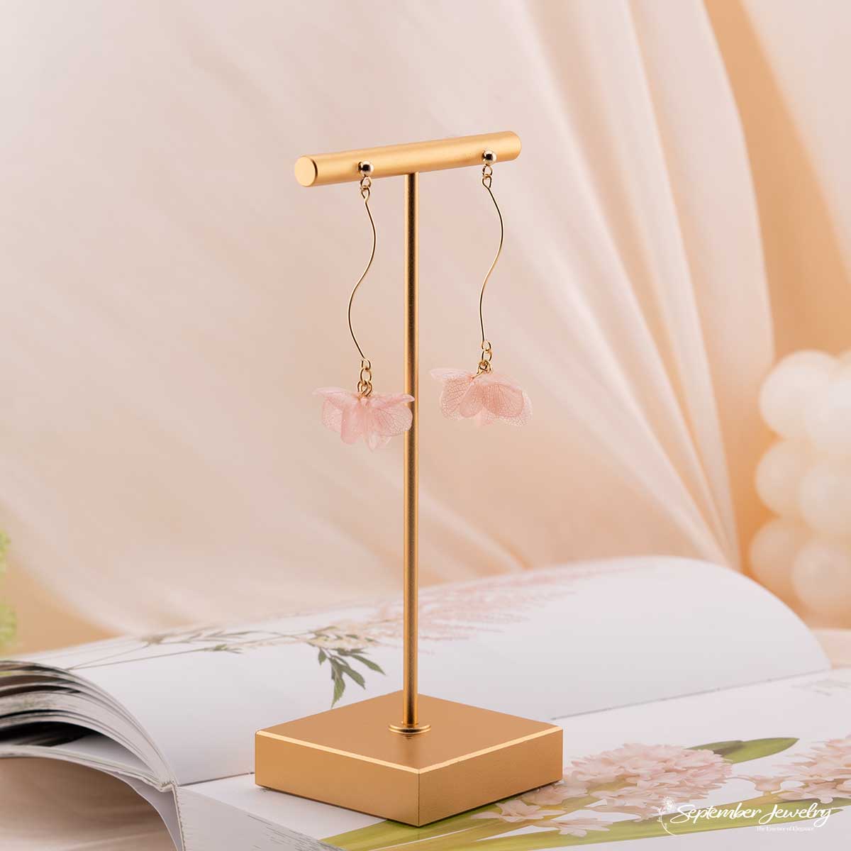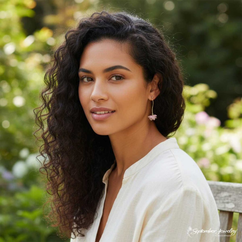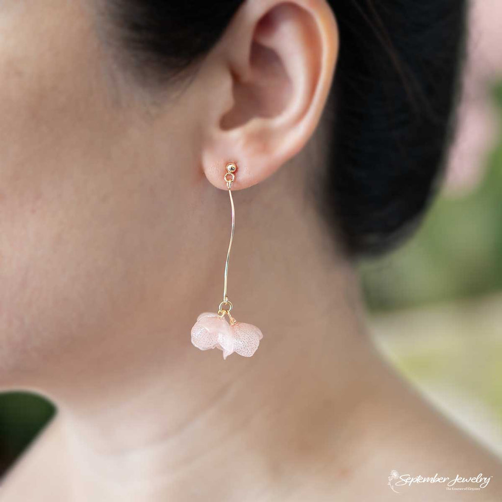 These earrings merge fluid wire artistry with the soft elegance of preserved blooms. The S-curve design adds a sense of motion, reflecting the gentle fall of petals in a spring breeze. Perfect for those who appreciate refined craftsmanship and naturally romantic style.