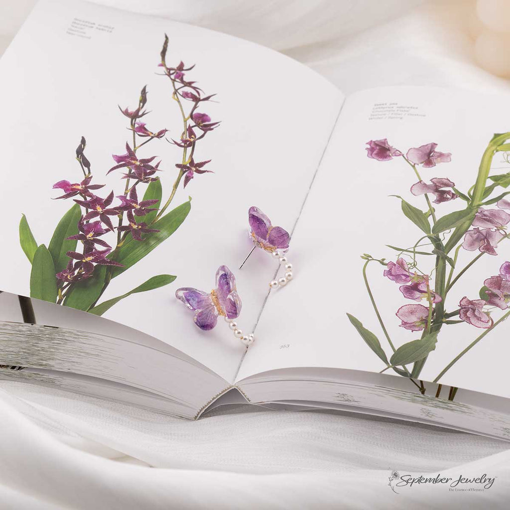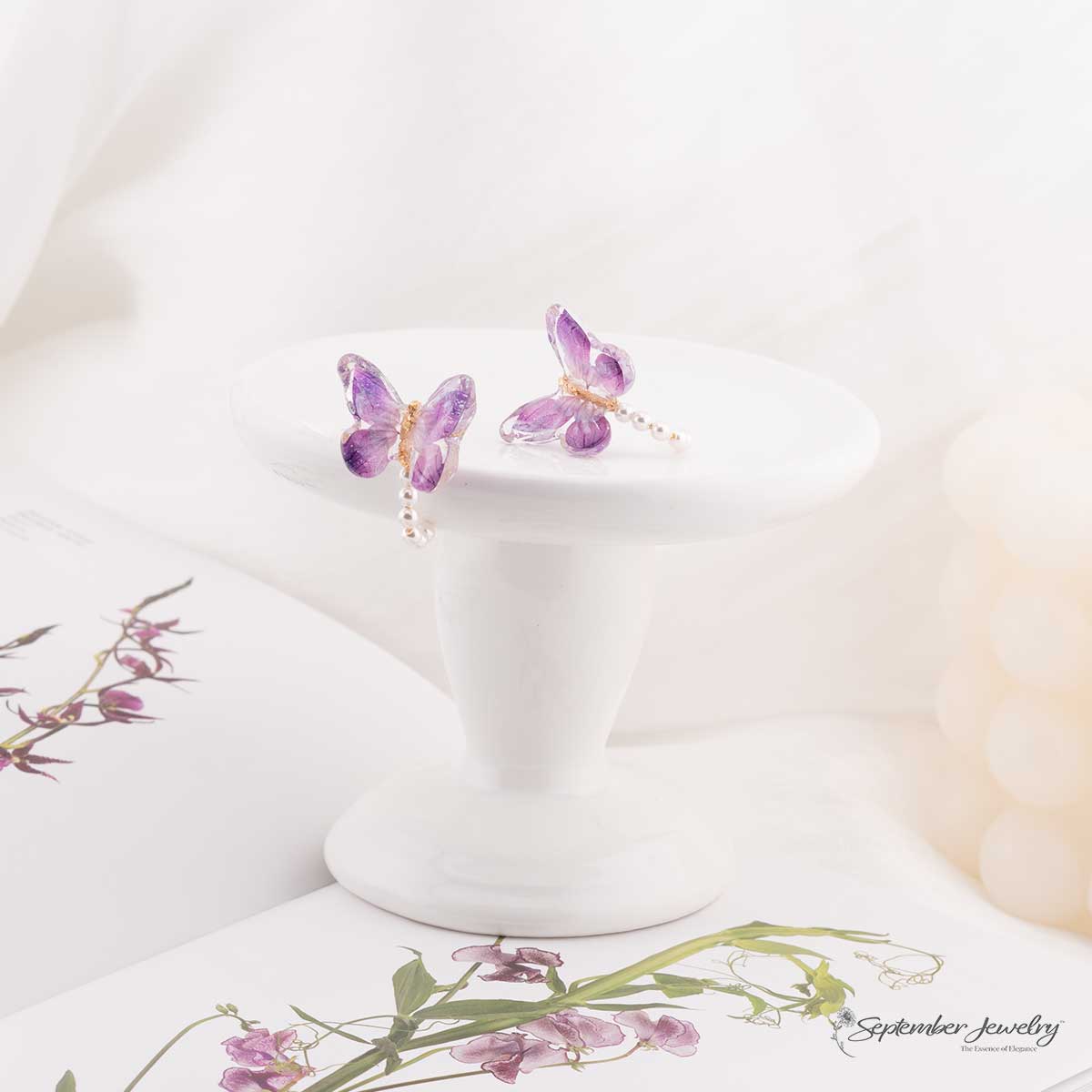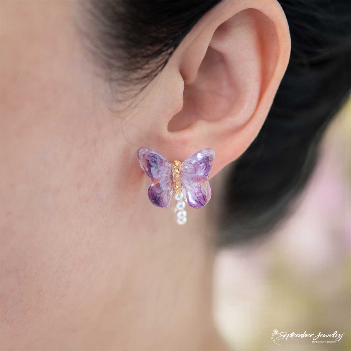 Elegant and enchanting, these earrings feature a purple butterfly design crafted with real hydrangea petals preserved in resin, finished with a six-pearl tail that sways delicately with every movement. The combination of soft floral hues and luminous pearls evokes a sense of quiet sophistication and timeless beauty.