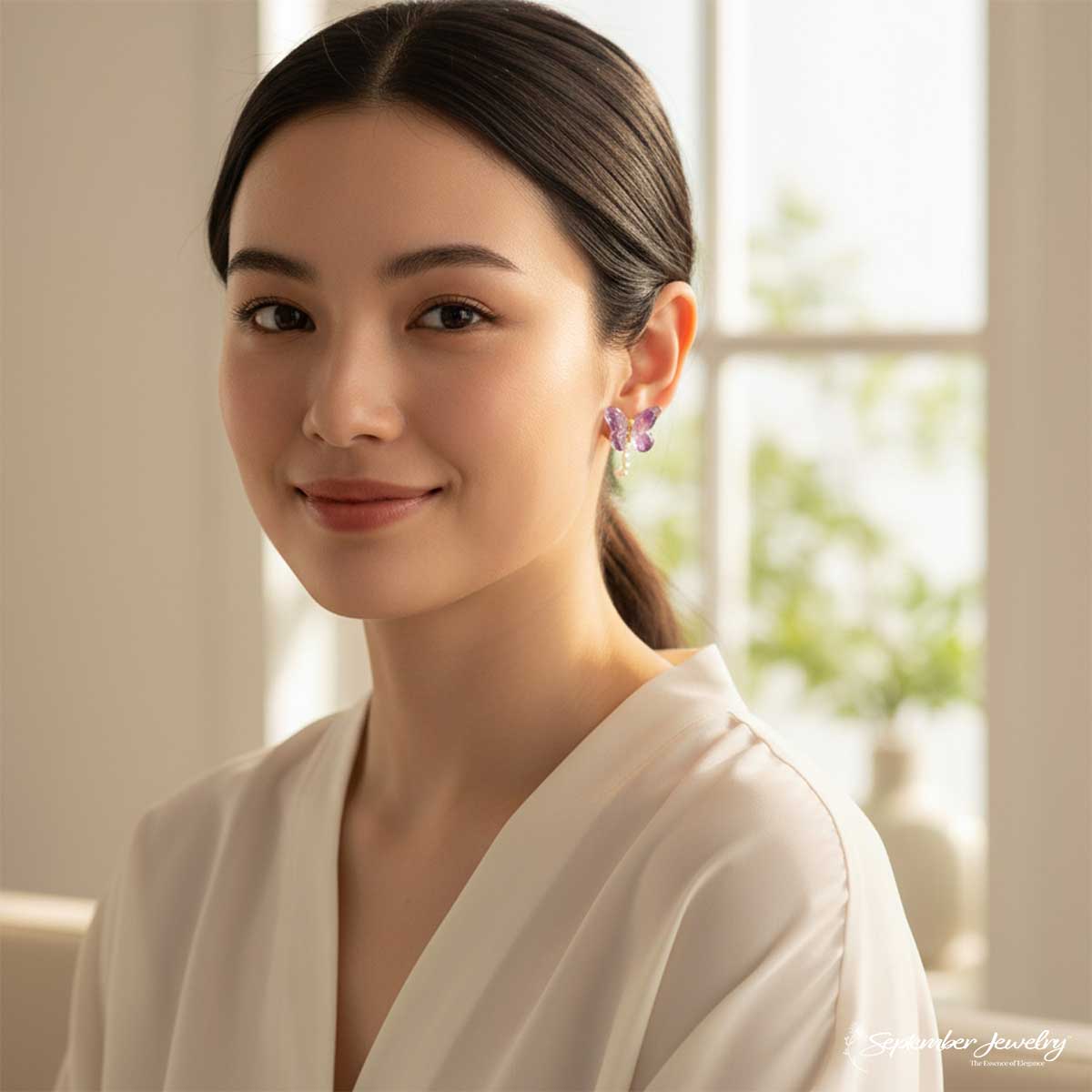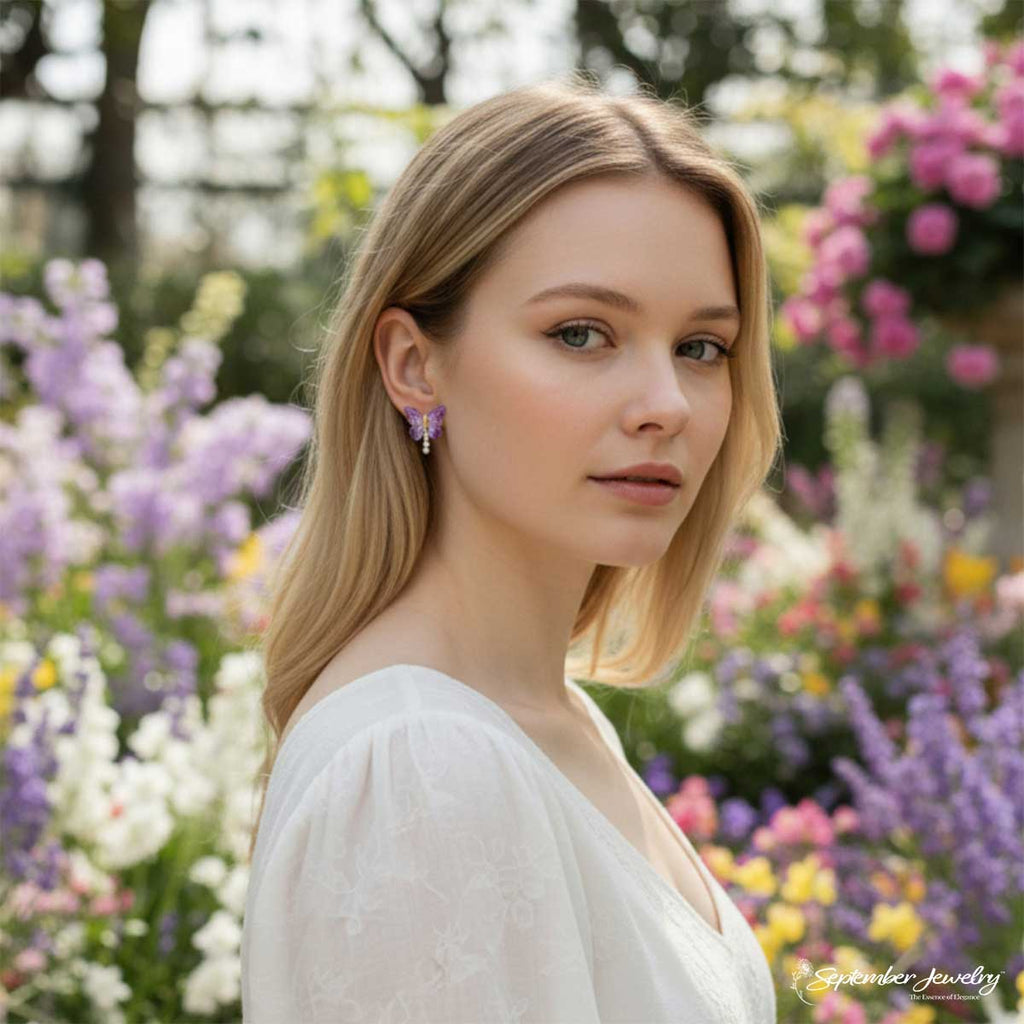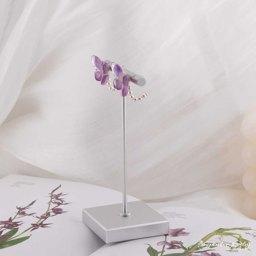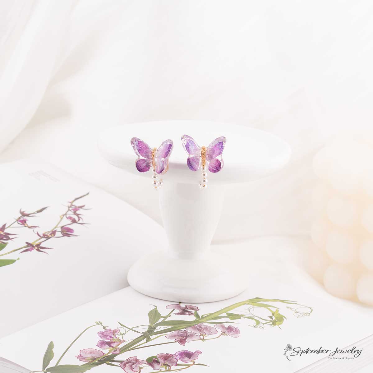 Elegant and enchanting, these earrings feature a purple butterfly design crafted with real hydrangea petals preserved in resin, finished with a six-pearl tail that sways delicately with every movement. The combination of soft floral hues and luminous pearls evokes a sense of quiet sophistication and timeless beauty.