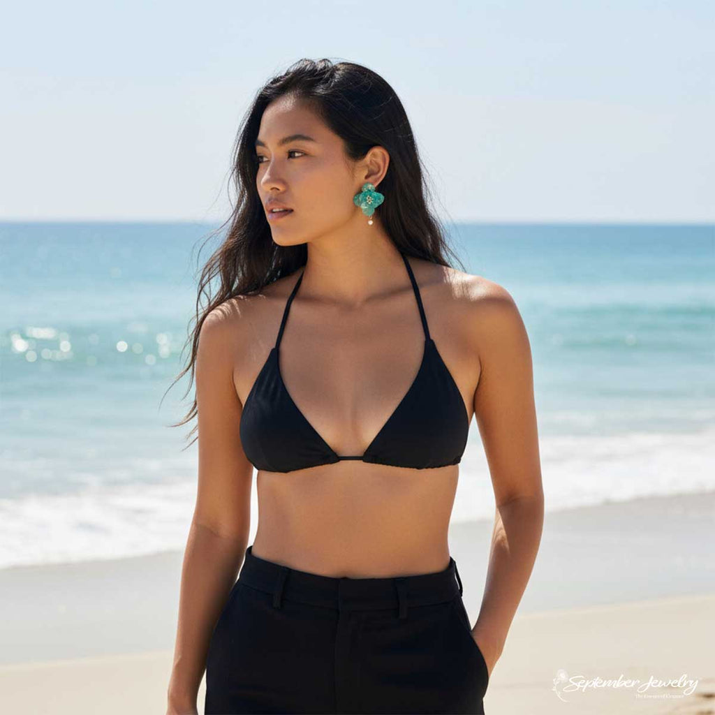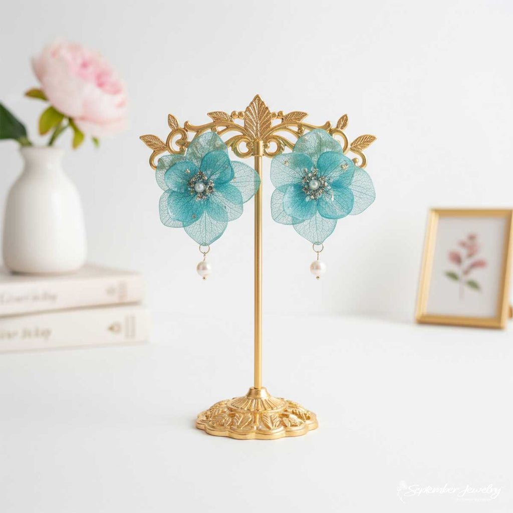 Ethereal and refreshing, these sea green hydrangea petal earrings are adorned with a lustrous freshwater pearl for a touch of timeless elegance. Each real hydrangea petal is preserved in resin, capturing soft oceanic tones that shimmer like sunlight through water. The design evokes the tranquility of coastal blooms, blending organic artistry with graceful sophistication.