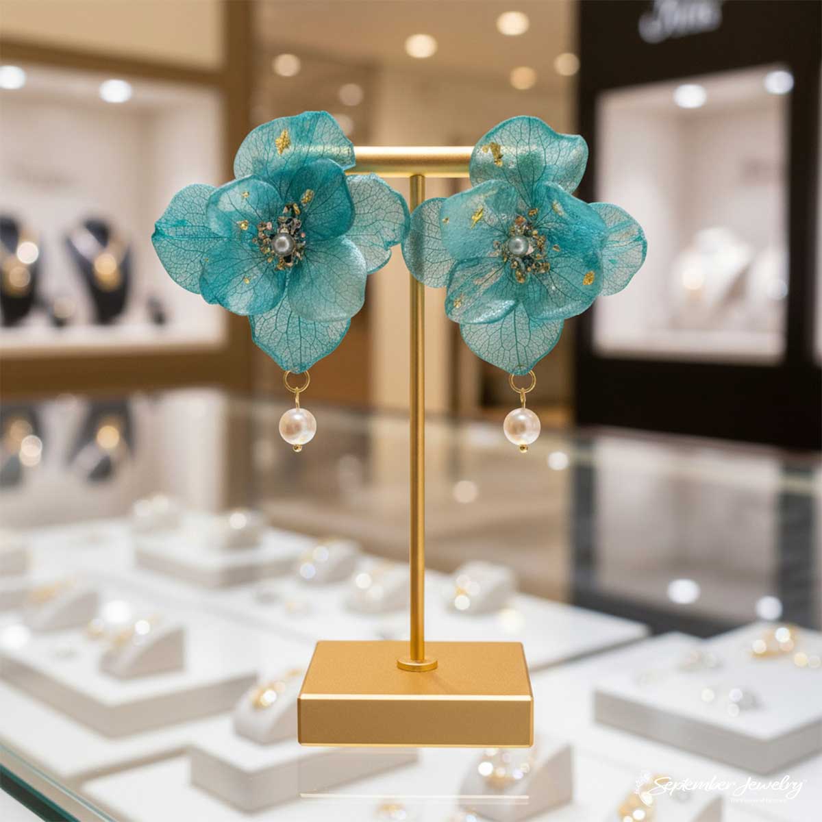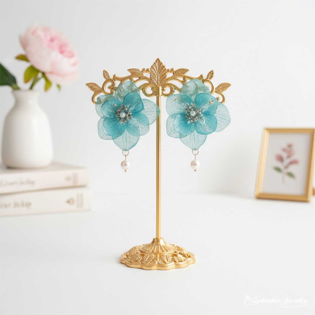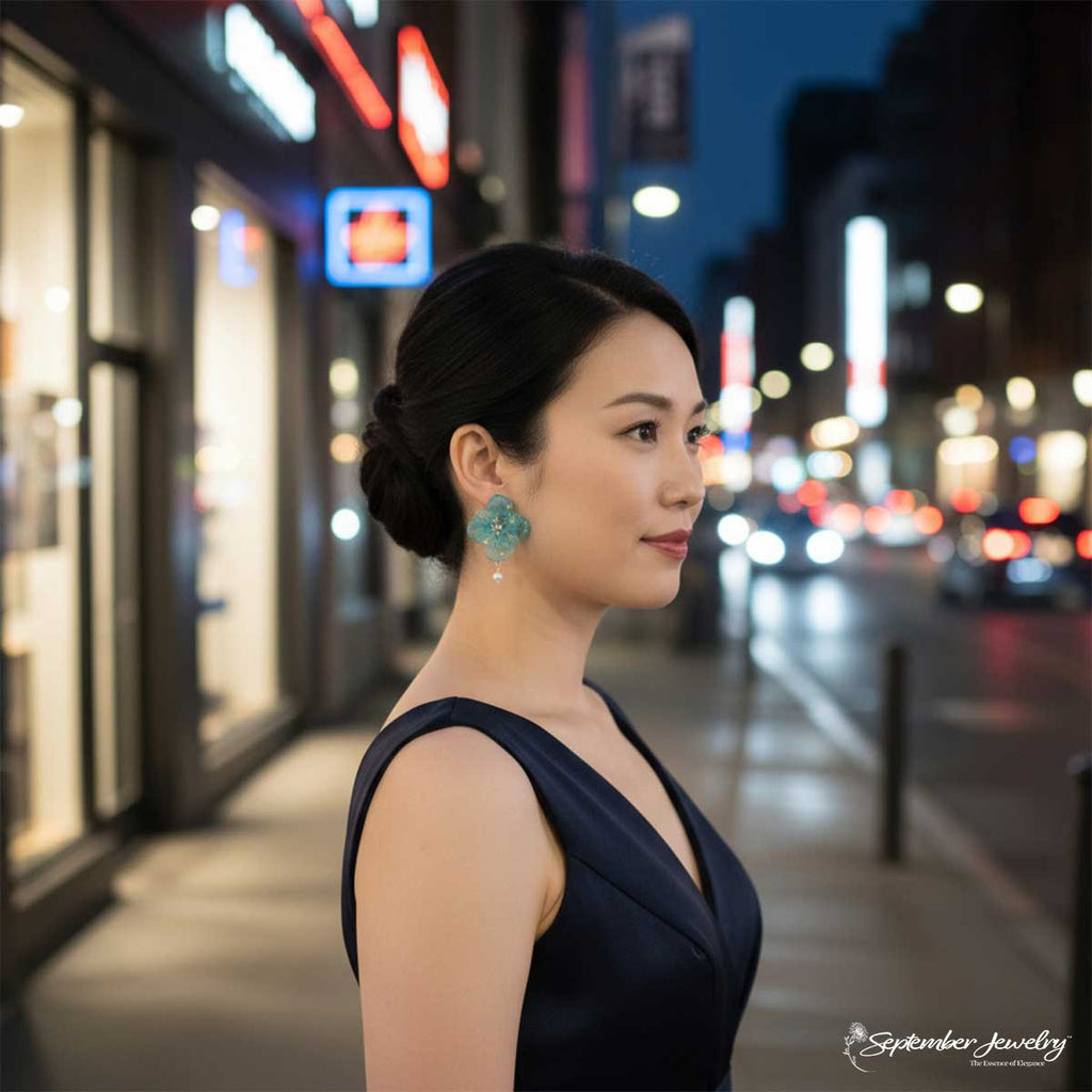 These earrings are a serene blend of nature’s finest details—the soft translucence of hydrangea petals paired with the subtle sheen of freshwater pearls. Their soothing color palette and graceful design make them a versatile favorite, equally stunning with airy linens or elegant evening wear.