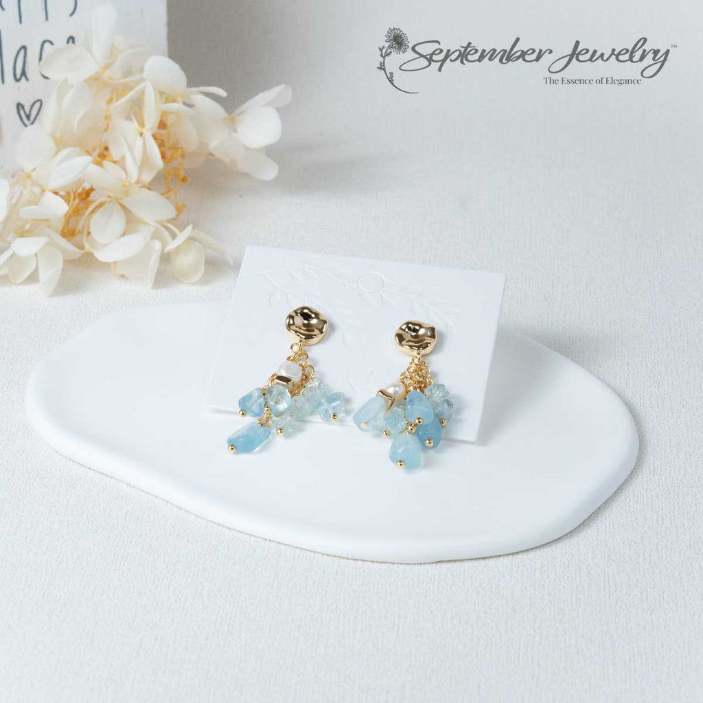 Elevate your look with the serene beauty of these Strings of Aquamarine Earrings. Featuring five elegant strings of soft blue aquamarine stones and lustrous white freshwater pearls, these earrings are designed to exude sophistication and tranquility. The calming blue of the aquamarine stones harmonizes perfectly with the classic pearls, creating a timeless and versatile accessory.