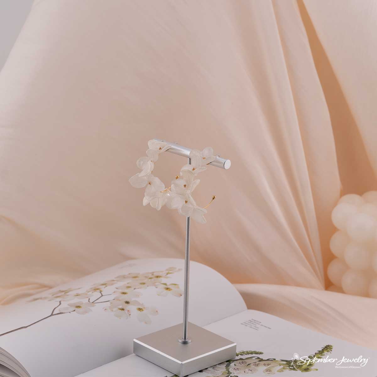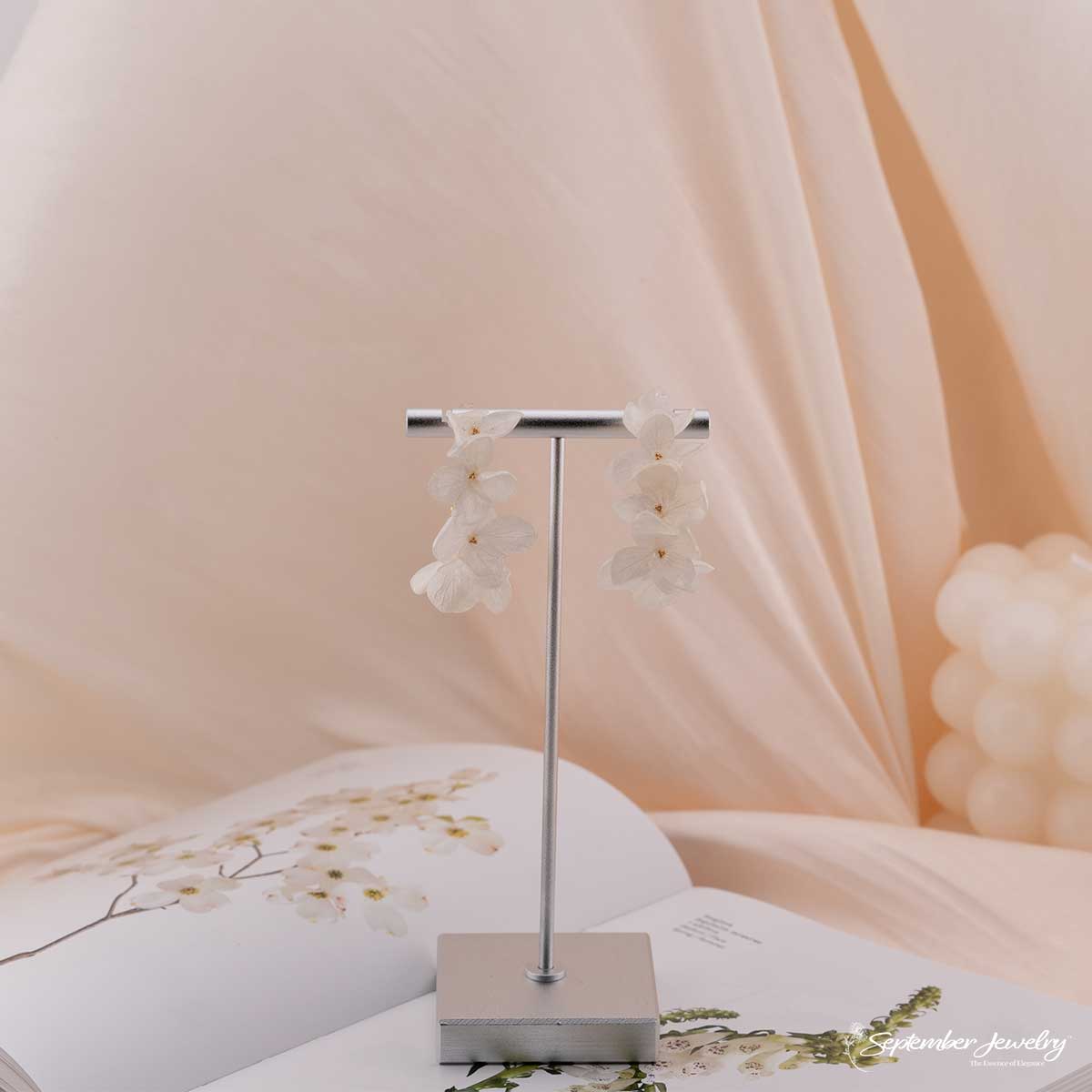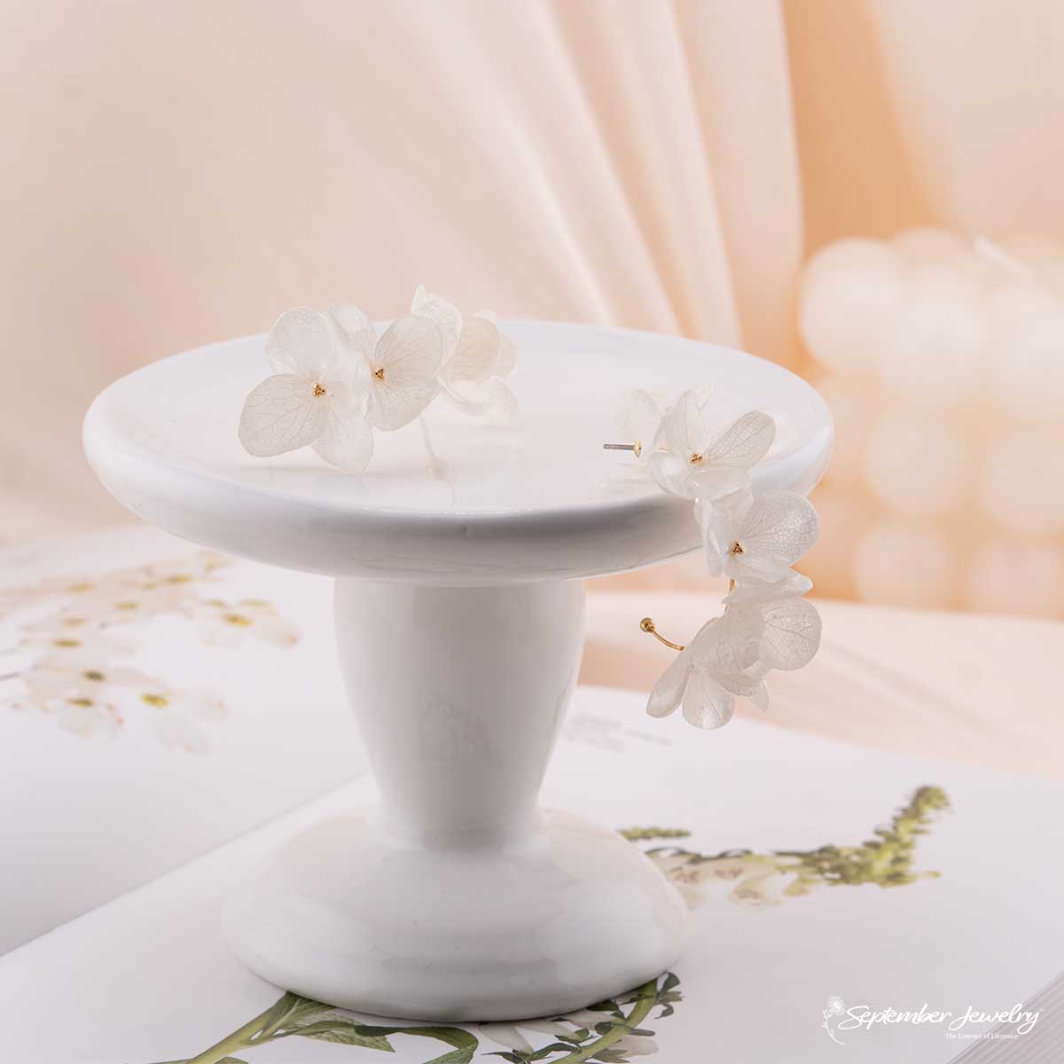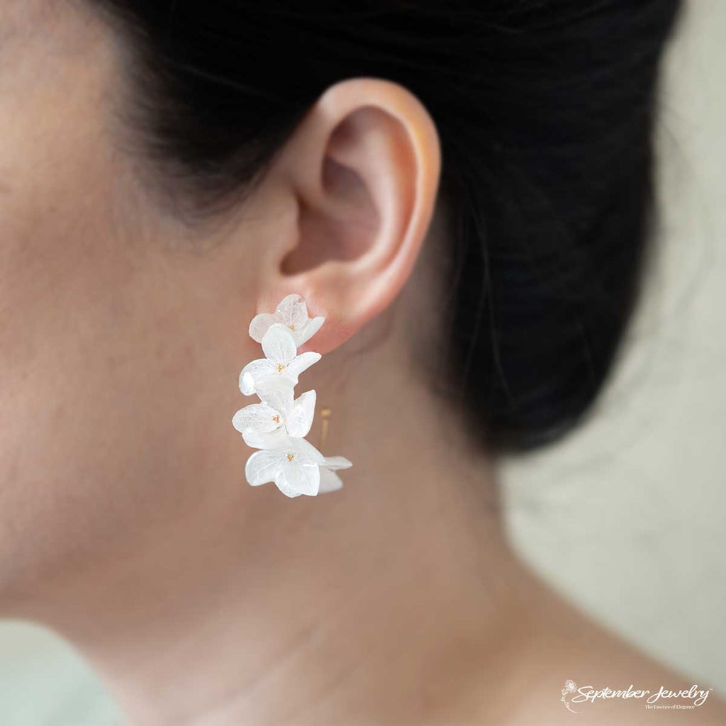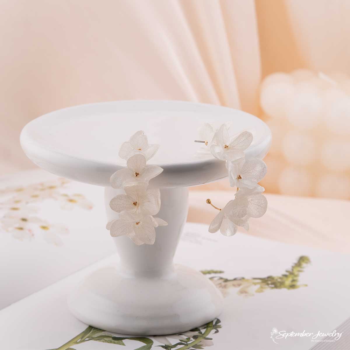 Elegant and serene, these real white hydrangea C-loop earrings celebrate the quiet beauty of nature in full bloom. Their clean white petals and gentle curves evoke a sense of calm purity, while the soft shimmer of gold adds a touch of timeless refinement.