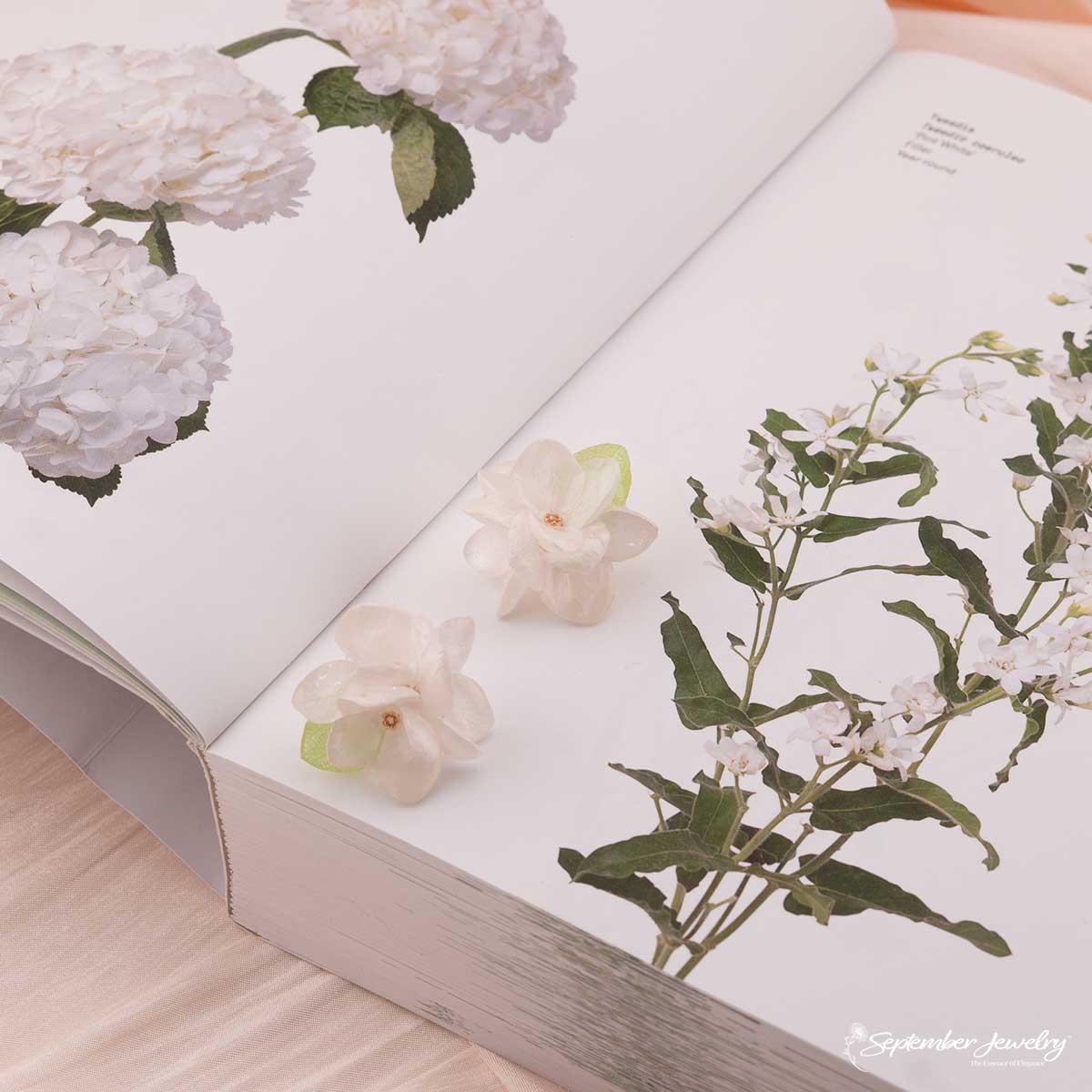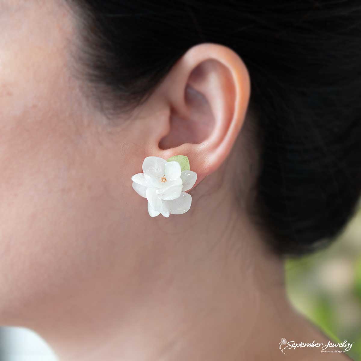 Graceful and luminous, these earrings feature a cluster of three real white hydrangea flowers preserved in resin, accented with delicate green leaves and gleaming gold beads. Their pure white tones and organic texture evoke a sense of natural elegance — serene, refined, and effortlessly beautiful.