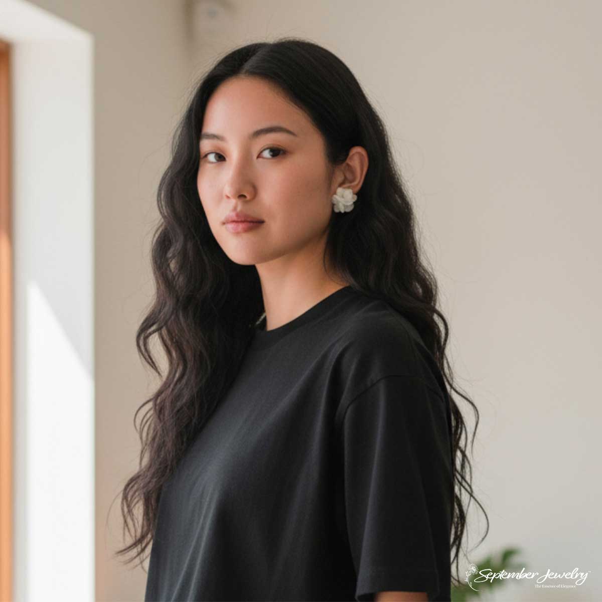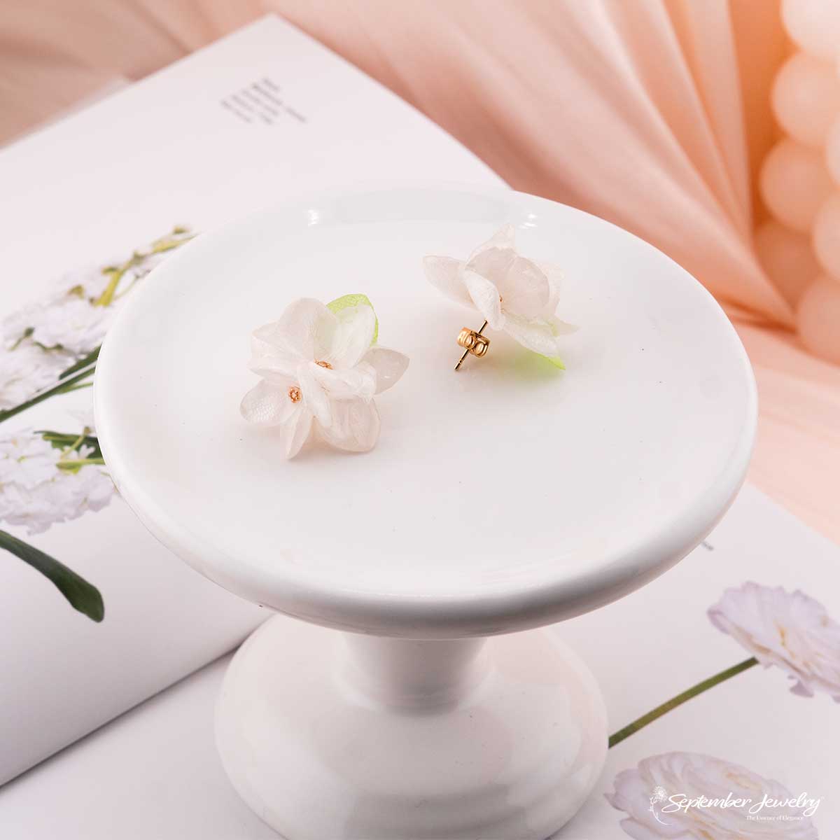 These earrings radiate quiet sophistication. The white petals glow softly against the gold accents, while the subtle touch of green adds natural freshness. Perfect for weddings, celebrations, or any moment that calls for understated elegance with an artisanal touch.